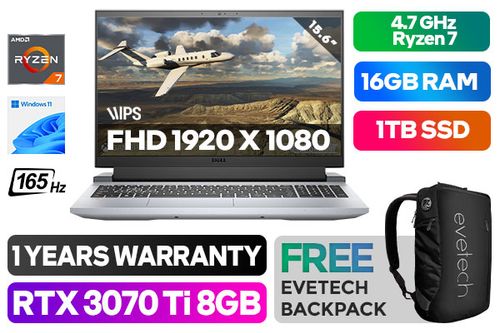 Dell Inspiron G15 15 5525 AMD Ryzen™ 7 6800H up to 4.7GHz Processor with AMD Max Boost Clock Technology, 20MB Cache, 8x Cores, 16x Threads / 16GB DDR5 RAM / 1TB Ultra-Fast NVMe SSD / 15.6" FHD (1920 x 1080) Anti-glare 165Hz Refresh Rate Display / NVIDIA 30 Series GeForce RTX 3070 Ti 8GB GDDR6 Dedicated Graphics / <span style="color:blue; font-size: 17px;">Windows 11 Home (64bit)</span> / MediaTek Wi-Fi 6 MT7921 Wireless LAN / Bluetooth 5.0 / HD (720p) Webcam with Digital Array Microphone / Full-sized White Backlit Gaming Keyboard With Numeric Keypad / 3x USB 3.2 Type-A / 1x USB 3.2 Type-C / 1x HDMI 2.1 / 1x Audio Out & Mic in Combo Jack / 2x 2.5W Stereo Speakers / 1 Year Warranty / Dell Inspiron G15 5525 Ryzen 7 RTX 3070 Ti Gaming LaptopDell Inspiron G15 15 5525 AMD Ryzen™ 7 6800H up to 4.7GHz Processor with AMD Max Boost Clock Technology, 20MB Cache, 8x Cores, 16x Threads / 16GB DDR5 RAM / 1TB Ultra-Fast NVMe SSD / 15.6" FHD (1920 x 1080) Anti-glare 165Hz Refresh Rate Display / NVIDIA 30 Series GeForce RTX 3070 Ti 8GB GDDR6 Dedicated Graphics / Windows 11 Home (64bit) / MediaTek Wi-Fi 6 MT7921 Wireless LAN / Bluetooth 5.0 / HD (720p) Webcam with Digital Array Microphone / Full-sized White Backlit Gaming Keyboard With Numeric Keypad / 3x USB 3.2 Type-A / 1x USB 3.2 Type-C / 1x HDMI 2.1 / 1x Audio Out & Mic in Combo Jack / 2x 2.5W Stereo Speakers / 1 Year Warranty / Dell Inspiron G15 5525 Ryzen 7 RTX 3070 Ti Gaming Laptop [NBDEI5525R7161711H] / [+] GET FREE EVETECH NEO Premium Gaming Backpack+ FREE DELIVERY !