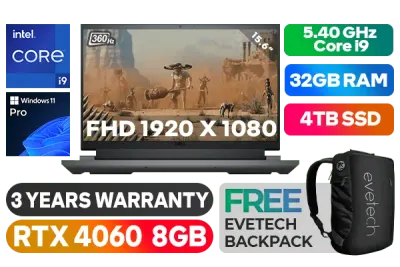 Dell Inspiron G15 15 5530 13th Gen Intel Core i9-13900HX up to 5.40GHz Processor, 36MB Cache, 24x Cores, 32x Threads / 32GB DDR5 RAM / 4TB Ultra-Fast NVMe SSD / 15.6" FHD (1920 x 1080) Anti-glare 360Hz Refresh Rate With IPS-Level Display / NVIDIA 40 Series GeForce RTX 4060 8GB GDDR6 Dedicated Graphics / <span style="font-size: 20px; color: #00BFFF; font-weight: bold;">Windows 11 Professional (64bit)</span> / Intel WiFi 6 AX201 Wireless LAN / Bluetooth v5.0 / HD Webcam with Digital Array Microphone / Full-sized White Backlit Gaming Keyboard With Numeric Keypad / 3x USB Type-A / 1x USB 3.1 Type-C / 1x HDMI 2.1 / 1x RJ45 / 1x Audio Out & Mic in Combo Jack / 2X Tuned Speakers with Dolby Audio / Dell Inspiron G15 5530 Core i9 RTX 4060 Gaming Laptop DealDell Inspiron G15 15 5530 13th Gen Intel Core i9-13900HX up to 5.40GHz Processor, 36MB Cache, 24x Cores, 32x Threads / 32GB DDR5 RAM / 4TB Ultra-Fast NVMe SSD / 15.6" FHD (1920 x 1080) Anti-glare 360Hz Refresh Rate With IPS-Level Display / NVIDIA 40 Series GeForce RTX 4060 8GB GDDR6 Dedicated Graphics / Windows 11 Professional (64bit) / Intel WiFi 6 AX201 Wireless LAN / Bluetooth v5.0 / HD Webcam with Digital Array Microphone / Full-sized White Backlit Gaming Keyboard With Numeric Keypad / 3x USB Type-A / 1x USB 3.1 Type-C / 1x HDMI 2.1 / 1x RJ45 / 1x Audio Out & Mic in Combo Jack / 2X Tuned Speakers with Dolby Audio / Dell Inspiron G15 5530 Core i9 RTX 4060 Gaming Laptop Deal [NBDEIG5530I9322611PE/4TB] / 3 YEARS WARRANTY / [+] GET FREE EVETECH NEO Premium Gaming Backpack+ FREE DELIVERY !