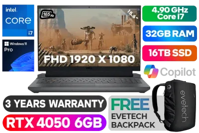 Dell Inspiron G15 15 5530 13th Gen Intel Core i7-13650HX up to 4.90GHz Processor, 24MB Cache, 14x Cores, 20x Threads / 32GB DDR5 RAM / 16TB Ultra-Fast NVMe SSD / 15.6" FHD (1920 x 1080) Anti-glare 3ms 165Hz Refresh Rate With IPS-Level Display / NVIDIA 40 Series GeForce RTX 4050 6GB GDDR6 Dedicated Graphics / <span style="font-size: 20px; color: #00BFFF; font-weight: bold;">Windows 11 Professional (64bit)</span> / Intel WiFi 6 AX201 Wireless LAN / Bluetooth® / HD Webcam with Digital Array Microphone / Full-sized White Backlit Gaming Keyboard With Numeric Keypad / 3 x USB Type-A / 1 x USB Type-C / 1 x HDMI 2.1 / 1 x RJ45 / 1 x Audio Out & Mic in Combo Jack / 2 x Tuned Speakers with Dolby Audio / Dell Inspiron G15 5530 Intel Core i7 RTX 4050 Gaming Laptop DealDell Inspiron G15 15 5530 13th Gen Intel Core i7-13650HX up to 4.90GHz Processor, 24MB Cache, 14x Cores, 20x Threads / 32GB DDR5 RAM / 16TB Ultra-Fast NVMe SSD / 15.6" FHD (1920 x 1080) Anti-glare 3ms 165Hz Refresh Rate With IPS-Level Display / NVIDIA 40 Series GeForce RTX 4050 6GB GDDR6 Dedicated Graphics / Windows 11 Professional (64bit) / Intel WiFi 6 AX201 Wireless LAN / Bluetooth® / HD Webcam with Digital Array Microphone / Full-sized White Backlit Gaming Keyboard With Numeric Keypad / 3 x USB Type-A / 1 x USB Type-C / 1 x HDMI 2.1 / 1 x RJ45 / 1 x Audio Out & Mic in Combo Jack / 2 x Tuned Speakers with Dolby Audio / Dell Inspiron G15 5530 Intel Core i7 RTX 4050 Gaming Laptop Deal [NBDEIG55301I716161PE/32GB/16TB] / 3 YEARS WARRANTY / [+] GET FREE EVETECH NEO Premium Gaming Backpack+ FREE DELIVERY !