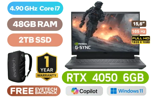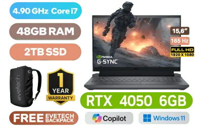 [G-SYNC] Dell Inspiron G15 5530 13th Gen Intel® Core⢠i7-13650HX up to 4.90GHz Processor, 24MB Cache,14x Cores, 20x Threads / 48GB DDR5 RAM / 2TB Ultra-Fast NVMe SSD / 15.6" FHD (1920 x 1080) Anti-glare 165Hz Refresh Rate Display / NVIDIA 40 Series GeForce RTX 4050 6GB GDDR6 Dedicated Graphics / Windows 11 Home (64bit) / Intel® Wi-Fi 6 AX201 Wireless LAN / Bluetooth 5.1 / 720P HD Webcam with Integrated Microphone / White Backlit Gaming Keyboard / 3x USB Type-A / 1x USB Type-C with DisplayPort / 1x HDMI 2.1 / 1x Headphone and Microphone combo Jack / 1x RJ45 / 2 Integrated Speakers with Dolby Audio / 1 Year Warranty / Dell Inspiron G15 5530 i7-13650HX RTX 4050 Gaming Laptop[G-SYNC] Dell Inspiron G15 5530 13th Gen Intel® Core⢠i7-13650HX up to 4.90GHz Processor, 24MB Cache,14x Cores, 20x Threads / 48GB DDR5 RAM / 2TB Ultra-Fast NVMe SSD / 15.6" FHD (1920 x 1080) Anti-glare 165Hz Refresh Rate Display / NVIDIA 40 Series GeForce RTX 4050 6GB GDDR6 Dedicated Graphics / Windows 11 Home (64bit) / Intel® Wi-Fi 6 AX201 Wireless LAN / Bluetooth 5.1 / 720P HD Webcam with Integrated Microphone / White Backlit Gaming Keyboard / 3x USB Type-A / 1x USB Type-C with DisplayPort / 1x HDMI 2.1 / 1x Headphone and Microphone combo Jack / 1x RJ45 / 2 Integrated Speakers with Dolby Audio / 1 Year Warranty / Dell Inspiron G15 5530 i7-13650HX RTX 4050 Gaming Laptop [NBDEIG5530I7161511HT/48GB/2TB] / [+] GET FREE EVETECH NEO Premium Gaming Backpack+ FREE DELIVERY !