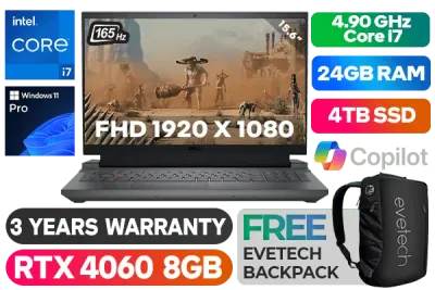 Dell Inspiron G15 15 5530 13th Gen Intel Core i7-13650HX up to 4.90GHz Processor, 24MB Cache, 14x Cores, 20x Threads / 24GB DDR5 RAM / 4TB Ultra-Fast NVMe SSD / 15.6" FHD (1920 x 1080) Anti-glare 3ms 165Hz Refresh Rate With IPS-Level Display / NVIDIA 40 Series GeForce RTX 4060 8GB GDDR6 Dedicated Graphics / <span style="font-size: 20px; color: #00BFFF; font-weight: bold;">Windows 11 Professional (64bit)</span> / Intel WiFi 6 AX201 Wireless LAN / Bluetooth® / HD Webcam with Digital Array Microphone / Full-sized White Backlit Gaming Keyboard With Numeric Keypad / 3 x USB Type-A / 1 x USB Type-C / 1 x HDMI 2.1 / 1 x RJ45 / 1 x Audio Out & Mic in Combo Jack / 2 x Tuned Speakers with Dolby Audio / Dell Inspiron G15 5530 Intel Core i7 RTX 4060 Gaming Laptop DealDell Inspiron G15 15 5530 13th Gen Intel Core i7-13650HX up to 4.90GHz Processor, 24MB Cache, 14x Cores, 20x Threads / 24GB DDR5 RAM / 4TB Ultra-Fast NVMe SSD / 15.6" FHD (1920 x 1080) Anti-glare 3ms 165Hz Refresh Rate With IPS-Level Display / NVIDIA 40 Series GeForce RTX 4060 8GB GDDR6 Dedicated Graphics / Windows 11 Professional (64bit) / Intel WiFi 6 AX201 Wireless LAN / Bluetooth® / HD Webcam with Digital Array Microphone / Full-sized White Backlit Gaming Keyboard With Numeric Keypad / 3 x USB Type-A / 1 x USB Type-C / 1 x HDMI 2.1 / 1 x RJ45 / 1 x Audio Out & Mic in Combo Jack / 2 x Tuned Speakers with Dolby Audio / Dell Inspiron G15 5530 Intel Core i7 RTX 4060 Gaming Laptop Deal [NBDEIG5530I7161511PE/24GB/4TB] / 3 YEARS WARRANTY / [+] GET FREE EVETECH NEO Premium Gaming Backpack+ FREE DELIVERY !