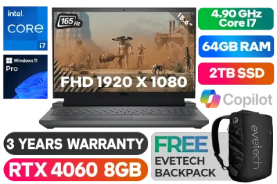Dell Inspiron G15 15 5530 13th Gen Intel Core i7-13650HX up to 4.90GHz Processor, 24MB Cache, 14x Cores, 20x Threads / 64GB DDR5 RAM / 2TB Ultra-Fast NVMe SSD / 15.6" FHD (1920 x 1080) Anti-glare 3ms 165Hz Refresh Rate With IPS-Level Display / NVIDIA 40 Series GeForce RTX 4060 8GB GDDR6 Dedicated Graphics / <span style="font-size: 20px; color: #00BFFF; font-weight: bold;">Windows 11 Professional (64bit)</span> / Intel WiFi 6 AX201 Wireless LAN / Bluetooth® / HD Webcam with Digital Array Microphone / Full-sized White Backlit Gaming Keyboard With Numeric Keypad / 3 x USB Type-A / 1 x USB Type-C / 1 x HDMI 2.1 / 1 x RJ45 / 1 x Audio Out & Mic in Combo Jack / 2 x Tuned Speakers with Dolby Audio / Dell Inspiron G15 5530 Intel Core i7 RTX 4060 Gaming Laptop DealDell Inspiron G15 15 5530 13th Gen Intel Core i7-13650HX up to 4.90GHz Processor, 24MB Cache, 14x Cores, 20x Threads / 64GB DDR5 RAM / 2TB Ultra-Fast NVMe SSD / 15.6" FHD (1920 x 1080) Anti-glare 3ms 165Hz Refresh Rate With IPS-Level Display / NVIDIA 40 Series GeForce RTX 4060 8GB GDDR6 Dedicated Graphics / Windows 11 Professional (64bit) / Intel WiFi 6 AX201 Wireless LAN / Bluetooth® / HD Webcam with Digital Array Microphone / Full-sized White Backlit Gaming Keyboard With Numeric Keypad / 3 x USB Type-A / 1 x USB Type-C / 1 x HDMI 2.1 / 1 x RJ45 / 1 x Audio Out & Mic in Combo Jack / 2 x Tuned Speakers with Dolby Audio / Dell Inspiron G15 5530 Intel Core i7 RTX 4060 Gaming Laptop Deal [NBDEIG5530I7161511PE/64GB/2TB] / 3 YEARS WARRANTY / [+] GET FREE EVETECH NEO Premium Gaming Backpack+ FREE DELIVERY !