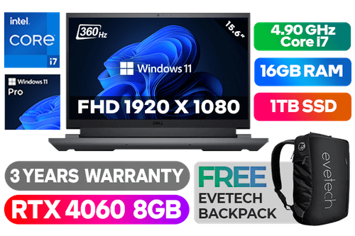 Dell Inspiron G15 15 5530 13th Gen Intel Core i7-13650HX up to 4.90GHz Processor, 24MB Cache, 14x Cores, 20x Threads / 16GB DDR5 RAM / 1TB Ultra-Fast NVMe SSD / 15.6" FHD (1920 x 1080) Anti-glare 1ms 360Hz Refresh Rate With IPS-Level Display / NVIDIA 40 Series GeForce RTX 4060 8GB GDDR6 Dedicated Graphics / <span style="color:blue; font-size: 17px;">Windows 11 Professional (64bit)</span> / Intel WiFi 6 AX201 Wireless LAN / Bluetooth V5.0 / HD Webcam with Digital Array Microphone / Full-sized White Backlit Gaming Keyboard With Numeric Keypad / 3x USB Type-A / 1x USB 3.1 Type-C / 1x HDMI 2.1 / 1x RJ45 / 1x Audio Out & Mic in Combo Jack / 2X Tuned Speakers with Dolby Audio / Dell Inspiron G15 5530 Core i7 RTX 4060 Gaming Laptop DealDell Inspiron G15 15 5530 13th Gen Intel Core i7-13650HX up to 4.90GHz Processor, 24MB Cache, 14x Cores, 20x Threads / 16GB DDR5 RAM / 1TB Ultra-Fast NVMe SSD / 15.6" FHD (1920 x 1080) Anti-glare 1ms 360Hz Refresh Rate With IPS-Level Display / NVIDIA 40 Series GeForce RTX 4060 8GB GDDR6 Dedicated Graphics / Windows 11 Professional (64bit) / Intel WiFi 6 AX201 Wireless LAN / Bluetooth V5.0 / HD Webcam with Digital Array Microphone / Full-sized White Backlit Gaming Keyboard With Numeric Keypad / 3x USB Type-A / 1x USB 3.1 Type-C / 1x HDMI 2.1 / 1x RJ45 / 1x Audio Out & Mic in Combo Jack / 2X Tuned Speakers with Dolby Audio / Dell Inspiron G15 5530 Core i7 RTX 4060 Gaming Laptop Deal [NBDEI5530GI73161W11P] / 3 YEARS WARRANTY / [+] GET FREE EVETECH NEO Premium Gaming Backpack+ FREE DELIVERY !