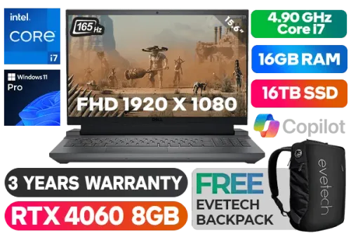 Dell Inspiron G15 15 5530 13th Gen Intel Core i7-13650HX up to 4.90GHz Processor, 24MB Cache, 14x Cores, 20x Threads / 16GB DDR5 RAM / 16TB Ultra-Fast NVMe SSD / 15.6" FHD (1920 x 1080) Anti-glare 3ms 165Hz Refresh Rate With IPS-Level Display / NVIDIA 40 Series GeForce RTX 4060 8GB GDDR6 Dedicated Graphics / <span style="font-size: 20px; color: #00BFFF; font-weight: bold;">Windows 11 Professional (64bit)</span> / Intel WiFi 6 AX201 Wireless LAN / Bluetooth® / HD Webcam with Digital Array Microphone / Full-sized White Backlit Gaming Keyboard With Numeric Keypad / 3 x USB Type-A / 1 x USB Type-C / 1 x HDMI 2.1 / 1 x RJ45 / 1 x Audio Out & Mic in Combo Jack / 2 x Tuned Speakers with Dolby Audio / Dell Inspiron G15 5530 Intel Core i7 RTX 4060 Gaming Laptop DealDell Inspiron G15 15 5530 13th Gen Intel Core i7-13650HX up to 4.90GHz Processor, 24MB Cache, 14x Cores, 20x Threads / 16GB DDR5 RAM / 16TB Ultra-Fast NVMe SSD / 15.6" FHD (1920 x 1080) Anti-glare 3ms 165Hz Refresh Rate With IPS-Level Display / NVIDIA 40 Series GeForce RTX 4060 8GB GDDR6 Dedicated Graphics / Windows 11 Professional (64bit) / Intel WiFi 6 AX201 Wireless LAN / Bluetooth® / HD Webcam with Digital Array Microphone / Full-sized White Backlit Gaming Keyboard With Numeric Keypad / 3 x USB Type-A / 1 x USB Type-C / 1 x HDMI 2.1 / 1 x RJ45 / 1 x Audio Out & Mic in Combo Jack / 2 x Tuned Speakers with Dolby Audio / Dell Inspiron G15 5530 Intel Core i7 RTX 4060 Gaming Laptop Deal [NBDEIG5530I7161511PE/16TB] / 3 YEARS WARRANTY / [+] GET FREE EVETECH NEO Premium Gaming Backpack+ FREE DELIVERY !