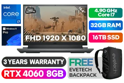 Dell Inspiron G15 15 5530 13th Gen Intel Core i7-13650HX up to 4.90GHz Processor, 24MB Cache, 14x Cores, 20x Threads / 32GB DDR5 RAM / 16TB Ultra-Fast NVMe SSD / 15.6" FHD (1920 x 1080) Anti-glare 1ms 360Hz Refresh Rate With IPS-Level Display / NVIDIA 40 Series GeForce RTX 4060 8GB GDDR6 Dedicated Graphics / <span style="font-size: 20px; color: #00BFFF; font-weight: bold;">Windows 11 Professional (64bit)</span> / Intel WiFi 6 AX201 Wireless LAN / Bluetooth v5.0 / HD Webcam with Digital Array Microphone / Full-sized White Backlit Gaming Keyboard With Numeric Keypad / 3x USB Type-A / 1x USB 3.1 Type-C / 1x HDMI 2.1 / 1x RJ45 / 1x Audio Out & Mic in Combo Jack / 2X Tuned Speakers with Dolby Audio / Dell Inspiron G15 5530 Core i7 RTX 4060 Gaming Laptop DealDell Inspiron G15 15 5530 13th Gen Intel Core i7-13650HX up to 4.90GHz Processor, 24MB Cache, 14x Cores, 20x Threads / 32GB DDR5 RAM / 16TB Ultra-Fast NVMe SSD / 15.6" FHD (1920 x 1080) Anti-glare 1ms 360Hz Refresh Rate With IPS-Level Display / NVIDIA 40 Series GeForce RTX 4060 8GB GDDR6 Dedicated Graphics / Windows 11 Professional (64bit) / Intel WiFi 6 AX201 Wireless LAN / Bluetooth v5.0 / HD Webcam with Digital Array Microphone / Full-sized White Backlit Gaming Keyboard With Numeric Keypad / 3x USB Type-A / 1x USB 3.1 Type-C / 1x HDMI 2.1 / 1x RJ45 / 1x Audio Out & Mic in Combo Jack / 2X Tuned Speakers with Dolby Audio / Dell Inspiron G15 5530 Core i7 RTX 4060 Gaming Laptop Deal [NBDEIG55303I716111PE/32GB/16TB] / 3 YEARS WARRANTY / [+] GET FREE EVETECH NEO Premium Gaming Backpack+ FREE DELIVERY !