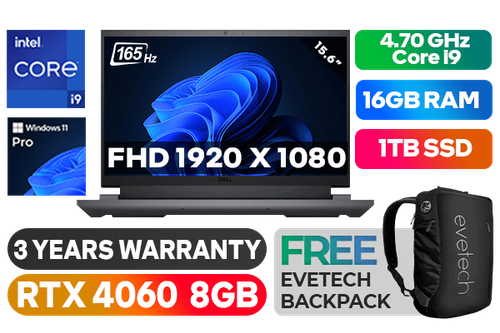 Dell Inspiron G15 15 5530 13th Gen Intel Core i9-13900HX up to 5.40GHz Processor, 36MB Cache, 24x Cores, 32x Threads / 16GB DDR5 RAM / 1TB Ultra-Fast NVMe SSD / 15.6" FHD (1920 x 1080) Anti-glare 165Hz Refresh Rate With IPS-Level Display / NVIDIA 40 Series GeForce RTX 4060 8GB GDDR6 Dedicated Graphics / <span style="font-size: 20px; color: #00BFFF; font-weight: bold;">Windows 11 Professional (64bit)</span> / Intel WiFi 6 AX201 Wireless LAN / Bluetooth V5.0 / HD Webcam with Digital Array Microphone / Full-sized White Backlit Gaming Keyboard With Numeric Keypad / 3x USB Type-A / 1x USB 3.1 Type-C / 1x HDMI 2.1 / 1x RJ45 / 1x Audio Out & Mic in Combo Jack / 2X Tuned Speakers with Dolby Audio / Dell Inspiron G15 5530 Core i9 RTX 4060 Gaming Laptop DealDell Inspiron G15 15 5530 13th Gen Intel Core i9-13900HX up to 5.40GHz Processor, 36MB Cache, 24x Cores, 32x Threads / 16GB DDR5 RAM / 1TB Ultra-Fast NVMe SSD / 15.6" FHD (1920 x 1080) Anti-glare 165Hz Refresh Rate With IPS-Level Display / NVIDIA 40 Series GeForce RTX 4060 8GB GDDR6 Dedicated Graphics / Windows 11 Professional (64bit) / Intel WiFi 6 AX201 Wireless LAN / Bluetooth V5.0 / HD Webcam with Digital Array Microphone / Full-sized White Backlit Gaming Keyboard With Numeric Keypad / 3x USB Type-A / 1x USB 3.1 Type-C / 1x HDMI 2.1 / 1x RJ45 / 1x Audio Out & Mic in Combo Jack / 2X Tuned Speakers with Dolby Audio / Dell Inspiron G15 5530 Core i9 RTX 4060 Gaming Laptop Deal [NBDEI5530GI91616W11P] / 3 YEARS WARRANTY / [+] GET FREE EVETECH NEO Premium Gaming Backpack+ FREE DELIVERY !