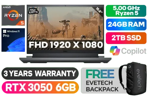 Dell Inspiron G15 15 5535 AMD Ryzen 5-7640HS up to 5.00GHz Processor, 22MB Cache, 6x Cores, 12x Threads / 24GB DDR5 RAM / 2TB Ultra-Fast NVMe SSD / 15.6" FHD 1920 x 1080 Anti-Glare 120Hz IPS-Level Display / NVIDIA 30 Series GeForce RTX 3050 6GB GDDR6 Dedicated Graphics / <span style="font-size: 20px; color: #00BFFF; font-weight: bold;">Windows 11 Professional (64bit)</span> / MediaTek Wi-Fi 6 MT7921 Wireless LAN / Bluetooth / HD Webcam with Digital Array Microphone / Full-sized White Backlit Keyboard With Numeric Keypad / 3x USB Type-A / 1x USB 3.1 Type-C / 1x HDMI 2.1 / 1x RJ45 / 1x Audio Out & Mic in Combo Jack / Stereo speakers / Dell Inspiron G15 5535 Ryzen 5 RTX 3050 Gaming Laptop DealDell Inspiron G15 15 5535 AMD Ryzen 5-7640HS up to 5.00GHz Processor, 22MB Cache, 6x Cores, 12x Threads / 24GB DDR5 RAM / 2TB Ultra-Fast NVMe SSD / 15.6" FHD 1920 x 1080 Anti-Glare 120Hz IPS-Level Display / NVIDIA 30 Series GeForce RTX 3050 6GB GDDR6 Dedicated Graphics / Windows 11 Professional (64bit) / MediaTek Wi-Fi 6 MT7921 Wireless LAN / Bluetooth / HD Webcam with Digital Array Microphone / Full-sized White Backlit Keyboard With Numeric Keypad / 3x USB Type-A / 1x USB 3.1 Type-C / 1x HDMI 2.1 / 1x RJ45 / 1x Audio Out & Mic in Combo Jack / Stereo speakers / Dell Inspiron G15 5535 Ryzen 5 RTX 3050 Gaming Laptop Deal [G5535-AMDR57640HS-8512GBPG-002/24GB/2TB] / 3 YEARS WARRANTY / [+] GET FREE EVETECH NEO Premium Gaming Backpack+ FREE DELIVERY !
