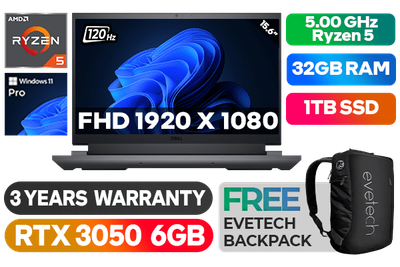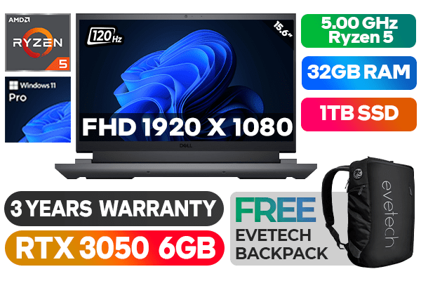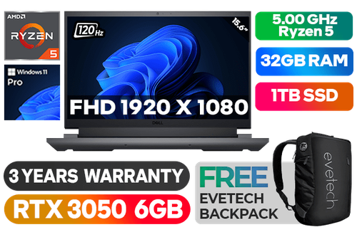 Dell Inspiron G15 15 5535 AMD Ryzen 5-7640HS up to 5.00GHz Processor, 22MB Cache, 6x Cores, 12x Threads / 32GB DDR5 RAM / 1TB Ultra-Fast NVMe SSD / 15.6" FHD 1920 x 1080 Anti-Glare 120Hz IPS-Level Display / NVIDIA 30 Series GeForce RTX 3050 6GB GDDR6 Dedicated Graphics / Windows 11 Pro (64bit) / MediaTek Wi-Fi 6 MT7921 Wireless LAN / Bluetooth / HD Webcam with Digital Array Microphone / Full-sized White Backlit Keyboard With Numeric Keypad / 3x USB Type-A / 1x USB 3.1 Type-C / 1x HDMI 2.1 / 1x RJ45 / 1x Audio Out & Mic in Combo Jack / Stereo speakers / Dell Inspiron G15 5535 Ryzen 5 RTX 3050 Gaming Laptop DealDell Inspiron G15 15 5535 AMD Ryzen 5-7640HS up to 5.00GHz Processor, 22MB Cache, 6x Cores, 12x Threads / 32GB DDR5 RAM / 1TB Ultra-Fast NVMe SSD / 15.6" FHD 1920 x 1080 Anti-Glare 120Hz IPS-Level Display / NVIDIA 30 Series GeForce RTX 3050 6GB GDDR6 Dedicated Graphics / Windows 11 Pro (64bit) / MediaTek Wi-Fi 6 MT7921 Wireless LAN / Bluetooth / HD Webcam with Digital Array Microphone / Full-sized White Backlit Keyboard With Numeric Keypad / 3x USB Type-A / 1x USB 3.1 Type-C / 1x HDMI 2.1 / 1x RJ45 / 1x Audio Out & Mic in Combo Jack / Stereo speakers / Dell Inspiron G15 5535 Ryzen 5 RTX 3050 Gaming Laptop Deal [G5535-AMDR57640HS-16512GBPG-00/32GB/1TB] / 3 YEARS WARRANTY / [+] GET FREE EVETECH NEO Premium Gaming Backpack+ FREE DELIVERY !