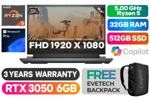 Dell Inspiron G15 15 5535 AMD Ryzen 5-7640HS up to 5.00GHz Processor, 22MB Cache, 6x Cores, 12x Threads / 32GB DDR5 RAM / 512GB Ultra-Fast NVMe SSD / 15.6" FHD 1920 x 1080 Anti-Glare 120Hz IPS-Level Display / NVIDIA 30 Series GeForce RTX 3050 6GB GDDR6 Dedicated Graphics / <span style="font-size: 20px; color: #00BFFF; font-weight: bold;">Windows 11 Professional (64bit)</span> / MediaTek Wi-Fi 6 MT7921 Wireless LAN / Bluetooth / HD Webcam with Digital Array Microphone / Full-sized White Backlit Keyboard With Numeric Keypad / 3x USB Type-A / 1x USB 3.1 Type-C / 1x HDMI 2.1 / 1x RJ45 / 1x Audio Out & Mic in Combo Jack / Stereo speakers / Dell Inspiron G15 5535 Ryzen 5 RTX 3050 Gaming Laptop DealDell Inspiron G15 15 5535 AMD Ryzen 5-7640HS up to 5.00GHz Processor, 22MB Cache, 6x Cores, 12x Threads / 32GB DDR5 RAM / 512GB Ultra-Fast NVMe SSD / 15.6" FHD 1920 x 1080 Anti-Glare 120Hz IPS-Level Display / NVIDIA 30 Series GeForce RTX 3050 6GB GDDR6 Dedicated Graphics / Windows 11 Professional (64bit) / MediaTek Wi-Fi 6 MT7921 Wireless LAN / Bluetooth / HD Webcam with Digital Array Microphone / Full-sized White Backlit Keyboard With Numeric Keypad / 3x USB Type-A / 1x USB 3.1 Type-C / 1x HDMI 2.1 / 1x RJ45 / 1x Audio Out & Mic in Combo Jack / Stereo speakers / Dell Inspiron G15 5535 Ryzen 5 RTX 3050 Gaming Laptop Deal [G5535-AMDR57640HS-8512GBPG-002/32GB] / 3 YEARS WARRANTY / [+] GET FREE EVETECH NEO Premium Gaming Backpack+ FREE DELIVERY !
