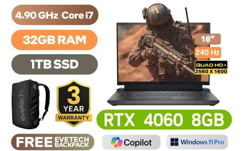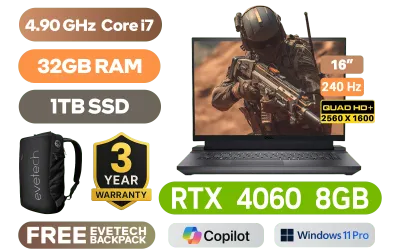 Dell Inspiron G16 7630 13th Gen Intel® Core™ i7-13650HX up to 4.90GHz Processor, 24MB Cache, 14x Cores, 20x Threads / 32GB DDR5 RAM / 1TB Ultra-Fast NVMe SSD / 16" QHD+ (2560 x 1600) Anti-glare 240Hz Anti-Glare Display / NVIDIA 40 Series GeForce RTX 4060 8GB GDDR6 Dedicated Graphics / <span style="color:blue; font-size: 17px;">Windows 11 Professional (64bit)</span> / Intel WiFi 6 AX201 Wireless LAN / Bluetooth 5.2 / Integrated Webcam / 2x Integrated Dolby Audio Speakers / 3x USB Type-A / 1x USB Type-C / 1x HDMI / 1x RJ-45 / 1x Headphone and Microphone Combo Jack / RGB Backlit Gaming Keyboard / Dell Inspiron G16 7630 Intel® Core™ i7 RTX 4060 Gaming Laptop DealDell Inspiron G16 7630 13th Gen Intel® Core™ i7-13650HX up to 4.90GHz Processor, 24MB Cache, 14x Cores, 20x Threads / 32GB DDR5 RAM / 1TB Ultra-Fast NVMe SSD / 16" QHD+ (2560 x 1600) Anti-glare 240Hz Anti-Glare Display / NVIDIA 40 Series GeForce RTX 4060 8GB GDDR6 Dedicated Graphics / Windows 11 Professional (64bit) / Intel WiFi 6 AX201 Wireless LAN / Bluetooth 5.2 / Integrated Webcam / 2x Integrated Dolby Audio Speakers / 3x USB Type-A / 1x USB Type-C / 1x HDMI / 1x RJ-45 / 1x Headphone and Microphone Combo Jack / RGB Backlit Gaming Keyboard / Dell Inspiron G16 7630 Intel® Core™ i7 RTX 4060 Gaming Laptop Deal [GALIO16_RPLH_2501_854_P] / 3 YEARS WARRANTY / [+] GET FREE EVETECH NEO Premium Gaming Backpack+ FREE DELIVERY !