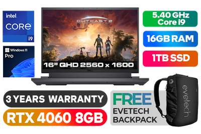 Dell Inspiron G16 7630 13th Gen Intel Core i9-13900HX up to 5.40GHz Processor, 36MB Cache, 24x Cores, 32x Threads / 16GB DDR5 RAM / 1TB Ultra-Fast NVMe SSD / 16" QHD+ (2560 x 1600) Anti-glare 240Hz Refresh Rate With IPS-Level Display / NVIDIA 40 Series GeForce RTX 4060 8GB GDDR6 Dedicated Graphics / <span style="font-size: 20px; color: #00BFFF; font-weight: bold;">Windows 11 Professional (64bit)</span> / Intel WiFi 6 AX201 Wireless LAN / Bluetooth 5.2 / HD RGB Webcam with Dual Array Microphone / 3x USB Type-A / 1x USB 3.1 Type-C / 1x HDMI 2.1 / 1x RJ45 / 1x Audio Out & Mic in Combo Jack / RGB Backlit Gaming Keyboard / Dell Inspiron G16 7630 Core i9 RTX 4060 Gaming Laptop DealDell Inspiron G16 7630 13th Gen Intel Core i9-13900HX up to 5.40GHz Processor, 36MB Cache, 24x Cores, 32x Threads / 16GB DDR5 RAM / 1TB Ultra-Fast NVMe SSD / 16" QHD+ (2560 x 1600) Anti-glare 240Hz Refresh Rate With IPS-Level Display / NVIDIA 40 Series GeForce RTX 4060 8GB GDDR6 Dedicated Graphics / Windows 11 Professional (64bit) / Intel WiFi 6 AX201 Wireless LAN / Bluetooth 5.2 / HD RGB Webcam with Dual Array Microphone / 3x USB Type-A / 1x USB 3.1 Type-C / 1x HDMI 2.1 / 1x RJ45 / 1x Audio Out & Mic in Combo Jack / RGB Backlit Gaming Keyboard / Dell Inspiron G16 7630 Core i9 RTX 4060 Gaming Laptop Deal [NBDEI7630GI91616W11P] / 3 YEARS WARRANTY / [+] GET FREE EVETECH NEO Premium Gaming Backpack+ FREE DELIVERY !