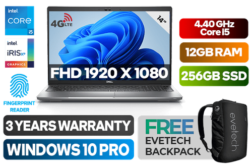 Dell Latitude 5430 12th Gen Intel Core i5-1235U up to 4.40GHz Processor, 12MB Cache, 10x Cores, 12x Threads / 12GB DDR4 RAM / 256GB Ultra-Fast NVMe SSD / 14" FHD 1920x1080 Anti-glare IPS Display / Integrated Intel Iris Xe Graphics / <span style="color:blue; font-size: 17px;">Windows 10 Professional (64bit)</span> / No DVD Writer Included / Intel Wi-fi 6E ax211 Wireless LAN / <span style="color:#b92abe; font-size: 18px;">Finger Print Reader</span> / Bluetooth / FHD IR Web camera, Dual-array microphones / 2x USB 3.2 Type-A / 2x USB Type-C With Thunderbolt 4 ports with DisplayPort / 1x HDMI 1.4 / MicroSD Card Reader / <span style="color:#2e9163; font-size: 18px;">1x Intel 7360 LTE Advanced eSIM Card Tray</span> / 1x RJ45 / 1x Audio In And Out Jack Combo / Single White Color Backlit Keyboard / Dell Latitude 5430 12th Gen Core i5 Laptop DealDell Latitude 5430 12th Gen Intel Core i5-1235U up to 4.40GHz Processor, 12MB Cache, 10x Cores, 12x Threads / 12GB DDR4 RAM / 256GB Ultra-Fast NVMe SSD / 14" FHD 1920x1080 Anti-glare IPS Display / Integrated Intel Iris Xe Graphics / Windows 10 Professional (64bit) / No DVD Writer Included / Intel Wi-fi 6E ax211 Wireless LAN / Finger Print Reader / Bluetooth / FHD IR Web camera, Dual-array microphones / 2x USB 3.2 Type-A / 2x USB Type-C With Thunderbolt 4 ports with DisplayPort / 1x HDMI 1.4 / MicroSD Card Reader / 1x Intel 7360 LTE Advanced eSIM Card Tray / 1x RJ45 / 1x Audio In And Out Jack Combo / Single White Color Backlit Keyboard / Dell Latitude 5430 12th Gen Core i5 Laptop Deal [1D-N201L5430MLK44G/12GB] / 3 YEARS WARRANTY / [+] GET FREE EVETECH NEO Premium Gaming Backpack+ FREE DELIVERY !