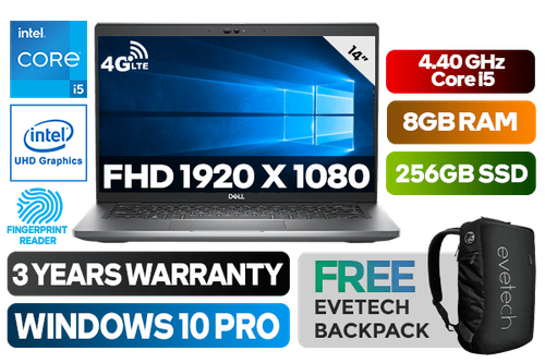 Dell Latitude 5430 12th Gen Intel Core i5-1235U up to 4.40GHz Processor, 12MB Cache, 10x Cores, 12x Threads / 8GB DDR4 RAM / 256GB Ultra-Fast NVMe SSD / 14" FHD 1920x1080 Anti-glare IPS Display / Integrated Intel UHD Graphics / <span style="color:blue; font-size: 17px;">Windows 10 Professional (64bit)</span> / No DVD Writer Included / Intel Wi-fi 6E ax211 Wireless LAN / <span style="color:#b92abe; font-size: 18px;">Finger Print Reader</span> / Bluetooth / FHD IR Web camera, Dual-array microphones / 2x USB 3.2 Type-A / 2x USB Type-C With Thunderbolt 4 ports with DisplayPort / 1x HDMI 1.4 / MicroSD Card Reader / <span style="color:#2e9163; font-size: 18px;">1x Intel 7360 LTE Advanced eSIM Card Tray</span> / 1x RJ45 / 1x Audio In And Out Jack Combo / Single White Color Backlit Keyboard / Dell Latitude 5430 12th Gen Core i5 Laptop DealDell Latitude 5430 12th Gen Intel Core i5-1235U up to 4.40GHz Processor, 12MB Cache, 10x Cores, 12x Threads / 8GB DDR4 RAM / 256GB Ultra-Fast NVMe SSD / 14" FHD 1920x1080 Anti-glare IPS Display / Integrated Intel UHD Graphics / Windows 10 Professional (64bit) / No DVD Writer Included / Intel Wi-fi 6E ax211 Wireless LAN / Finger Print Reader / Bluetooth / FHD IR Web camera, Dual-array microphones / 2x USB 3.2 Type-A / 2x USB Type-C With Thunderbolt 4 ports with DisplayPort / 1x HDMI 1.4 / MicroSD Card Reader / 1x Intel 7360 LTE Advanced eSIM Card Tray / 1x RJ45 / 1x Audio In And Out Jack Combo / Single White Color Backlit Keyboard / Dell Latitude 5430 12th Gen Core i5 Laptop Deal [N201L5430MLK14EMEA_VP-4G] / 3 YEARS WARRANTY / [+] GET FREE EVETECH NEO Premium Gaming Backpack+ FREE DELIVERY !