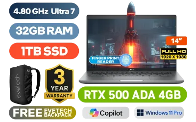 DELL Precision 3490 Intel Core Ultra 7-155H up to 4.80GHz Processor, 24MB Cache, 16x Cores, 22x Threads / 32GB DDR5 RAM / 1TB Ultra-Fast NVMe SSD / 14" FHD 1920x1080 Anti-Glare Display / NVIDIA RTX 500 ADA Generation 4GB GDDR6 Dedicated Workstation Graphics Card / <span style="font-size: 20px; color: #00BFFF; font-weight: bold;">Windows 11 Professional (64bit)</span> / Fingerprint Reader / Intel Wi-Fi 6E AX211 Wireless LAN / Bluetooth® / FHD IR camera with privacy shutter / 2x USB 3.2 Type-A / 2x USB Type-C Thunderbolt 4 / 1x HDMI / 1x Audio and Microphone Combo Jack / 1x RJ-45 Ethernet port / No DVD Drive Included / White Backlit Keyboard / Stereo speakers with Waves MaxxAudio® Pro Audio / DELL Precision 3490 Intel Core Ultra 7 RTX 500 ADA Workstation Laptop DealDELL Precision 3490 Intel Core Ultra 7-155H up to 4.80GHz Processor, 24MB Cache, 16x Cores, 22x Threads / 32GB DDR5 RAM / 1TB Ultra-Fast NVMe SSD / 14" FHD 1920x1080 Anti-Glare Display / NVIDIA RTX 500 ADA Generation 4GB GDDR6 Dedicated Workstation Graphics Card / Windows 11 Professional (64bit) / Fingerprint Reader / Intel Wi-Fi 6E AX211 Wireless LAN / Bluetooth® / FHD IR camera with privacy shutter / 2x USB 3.2 Type-A / 2x USB Type-C Thunderbolt 4 / 1x HDMI / 1x Audio and Microphone Combo Jack / 1x RJ-45 Ethernet port / No DVD Drive Included / White Backlit Keyboard / Stereo speakers with Waves MaxxAudio® Pro Audio / DELL Precision 3490 Intel Core Ultra 7 RTX 500 ADA Workstation Laptop Deal [N004P3490EMEAVP] / [+] GET FREE EVETECH NEO Premium Gaming Backpack / 3 YEARS WARRANTY / [+] GET FREE Promate Baton TWS Earbuds+ FREE DELIVERY !