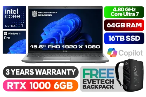 DELL Precision 3591-0983 Intel Core Ultra 7-155H up to 4.80GHz Processor, 24MB Cache, 16x Cores, 22x Threads / 64GB DDR5 RAM / 16TB Ultra-Fast NVMe SSD / 15.6" FHD 1920x1080 Anti-Glare Display / NVIDIA RTX 1000 ADA Generation 6GB GDDR6 Dedicated Workstation Graphics Card / <span style="font-size: 20px; color: #00BFFF; font-weight: bold;">Windows 11 Professional (64bit)</span> / Intel Wi-Fi 6E AX211 Wireless LAN / Bluetooth® / FHD IR camera with privacy shutter / 2x USB Type-A / 2x USB Type-C Thunderbolt 4 / 1x HDMI / 1x Audio and Microphone Combo Jack / 1x RJ-45 Ethernet Port / 1x Smart Card Reader / MicroSD Card Reader / White Backlit Keyboard / Fingerprint Reader / DELL Precision 3591 Intel Core Ultra 7 RTX 1000 ADA Workstation Laptop DealDELL Precision 3591-0983 Intel Core Ultra 7-155H up to 4.80GHz Processor, 24MB Cache, 16x Cores, 22x Threads / 64GB DDR5 RAM / 16TB Ultra-Fast NVMe SSD / 15.6" FHD 1920x1080 Anti-Glare Display / NVIDIA RTX 1000 ADA Generation 6GB GDDR6 Dedicated Workstation Graphics Card / Windows 11 Professional (64bit) / Intel Wi-Fi 6E AX211 Wireless LAN / Bluetooth® / FHD IR camera with privacy shutter / 2x USB Type-A / 2x USB Type-C Thunderbolt 4 / 1x HDMI / 1x Audio and Microphone Combo Jack / 1x RJ-45 Ethernet Port / 1x Smart Card Reader / MicroSD Card Reader / White Backlit Keyboard / Fingerprint Reader / DELL Precision 3591 Intel Core Ultra 7 RTX 1000 ADA Workstation Laptop Deal [NBDEN104P3591EMEA/64GB/16TB] / 3 YEARS WARRANTY / [+] GET FREE EVETECH NEO Premium Gaming Backpack+ FREE DELIVERY !