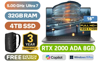 DELL Precision 5690-0419 Intel® Core™ Ultra 7-165H up to 5.00GHz Processor, 24MB Cache, 16x Cores, 22x Threads / 32GB DDR5 RAM / 4TB Ultra-Fast NVMe SSD / 16" FHD+ (1920 x 1200) IPS Level Display / NVIDIA RTX 2000 ADA Generation 8GB GDDR6 Dedicated Workstation Graphics Card / <span style="font-size: 20px; color: #00BFFF; font-weight: bold;">Windows 11 Professional (64bit)</span> / Intel Wi-Fi 7 BE200 Wireless LAN / Bluetooth 5.4 / FHD 1080p Camera With Privacy Shutter / 1x USB Type-C (Display port) / 2x USB Type-C (Thunderbolt 4 with PowerDelivery) / 1x HDMI 2.1/ 1x Audio and Microphone Combo Jack / SD Card Reader / White Backlit Keyboard / Fingerprint Reader / DELL Precision 5690 Intel® Core™ Ultra 7 RTX 2000 ADA Workstation Laptop DealDELL Precision 5690-0419 Intel® Core™ Ultra 7-165H up to 5.00GHz Processor, 24MB Cache, 16x Cores, 22x Threads / 32GB DDR5 RAM / 4TB Ultra-Fast NVMe SSD / 16" FHD+ (1920 x 1200) IPS Level Display / NVIDIA RTX 2000 ADA Generation 8GB GDDR6 Dedicated Workstation Graphics Card / Windows 11 Professional (64bit) / Intel Wi-Fi 7 BE200 Wireless LAN / Bluetooth 5.4 / FHD 1080p Camera With Privacy Shutter / 1x USB Type-C (Display port) / 2x USB Type-C (Thunderbolt 4 with PowerDelivery) / 1x HDMI 2.1/ 1x Audio and Microphone Combo Jack / SD Card Reader / White Backlit Keyboard / Fingerprint Reader / DELL Precision 5690 Intel® Core™ Ultra 7 RTX 2000 ADA Workstation Laptop Deal [N001P5690EMEA_VP/4TB] / [+] GET FREE EVETECH NEO Premium Gaming Backpack / 3 YEARS WARRANTY + FREE DELIVERY !