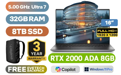 DELL Precision 5690-0419 Intel® Core™ Ultra 7-165H up to 5.00GHz Processor, 24MB Cache, 16x Cores, 22x Threads / 32GB DDR5 RAM / 8TB Ultra-Fast NVMe SSD / 16" FHD+ (1920 x 1200) IPS Level Display / NVIDIA RTX 2000 ADA Generation 8GB GDDR6 Dedicated Workstation Graphics Card / <span style="font-size: 20px; color: #00BFFF; font-weight: bold;">Windows 11 Professional (64bit)</span> / Intel Wi-Fi 7 BE200 Wireless LAN / Bluetooth 5.4 / FHD 1080p Camera With Privacy Shutter / 1x USB Type-C (Display port) / 2x USB Type-C (Thunderbolt 4 with PowerDelivery) / 1x HDMI 2.1/ 1x Audio and Microphone Combo Jack / SD Card Reader / White Backlit Keyboard / Fingerprint Reader / DELL Precision 5690 Intel® Core™ Ultra 7 RTX 2000 ADA Workstation Laptop DealDELL Precision 5690-0419 Intel® Core™ Ultra 7-165H up to 5.00GHz Processor, 24MB Cache, 16x Cores, 22x Threads / 32GB DDR5 RAM / 8TB Ultra-Fast NVMe SSD / 16" FHD+ (1920 x 1200) IPS Level Display / NVIDIA RTX 2000 ADA Generation 8GB GDDR6 Dedicated Workstation Graphics Card / Windows 11 Professional (64bit) / Intel Wi-Fi 7 BE200 Wireless LAN / Bluetooth 5.4 / FHD 1080p Camera With Privacy Shutter / 1x USB Type-C (Display port) / 2x USB Type-C (Thunderbolt 4 with PowerDelivery) / 1x HDMI 2.1/ 1x Audio and Microphone Combo Jack / SD Card Reader / White Backlit Keyboard / Fingerprint Reader / DELL Precision 5690 Intel® Core™ Ultra 7 RTX 2000 ADA Workstation Laptop Deal [N001P5690EMEA_VP/8TB] / [+] GET FREE EVETECH NEO Premium Gaming Backpack / 3 YEARS WARRANTY + FREE DELIVERY !