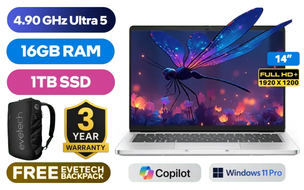 Dell Pro 14 PC14250 Intel® Core™ Ultra 5-235U up to 4.90GHz Processor, 12MB Cache, 12x Cores, 14x Threads / 16GB DDR5 RAM / 1TB Ultra-Fast NVMe SSD / 14" FHD+ (1920 x 1200) IPS-Level Display / Integrated Intel® Graphics / <span style="font-size: 20px; color: #00BFFF; font-weight: bold;">Windows 11 Professional (64bit)</span> / Intel® WiFi 6E AX211 Wireless LAN / Bluetooth 5.3 / 1080p FHD IR Camera / 2 x USB Type-A / 2 x USB Type-C (Thunderbolt™ 4 / DisplayPort™ 2.1 / Power Delivery 3.1 ) / 1 x HDMI / 1 x Headphone & Microphone Combo Jack / 1x RJ-45 / Waves MaxxAudio® Pro Stereo Speakers / Fingerprint Reader / White Backlit keyboard / Dell Pro 14 PC14250 Core™ Ultra 5 Laptop Dell Pro 14 PC14250 Intel® Core™ Ultra 5-235U up to 4.90GHz Processor, 12MB Cache, 12x Cores, 14x Threads / 16GB DDR5 RAM / 1TB Ultra-Fast NVMe SSD / 14" FHD+ (1920 x 1200) IPS-Level Display / Integrated Intel® Graphics / Windows 11 Professional (64bit) / Intel® WiFi 6E AX211 Wireless LAN / Bluetooth 5.3 / 1080p FHD IR Camera / 2 x USB Type-A / 2 x USB Type-C (Thunderbolt™ 4 / DisplayPort™ 2.1 / Power Delivery 3.1 ) / 1 x HDMI / 1 x Headphone & Microphone Combo Jack / 1x RJ-45 / Waves MaxxAudio® Pro Stereo Speakers / Fingerprint Reader / White Backlit keyboard / Dell Pro 14 PC14250 Core™ Ultra 5 Laptop [NBDEBTO106PC14250EM/1TB] / [+] GET FREE EVETECH NEO Premium Gaming Backpack / 3 YEARS WARRANTY + FREE DELIVERY !