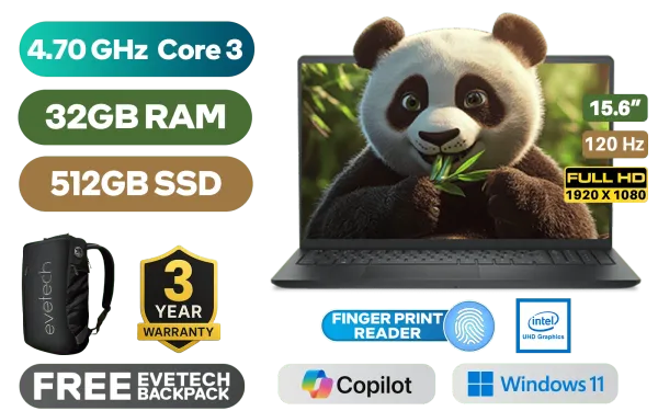 Dell Pro 15 Essential PV15250 Intel Core 3-100U up to 4.70GHz Processor, 10MB Cache, 6x Cores, 8x Threads / 32GB DDR5 RAM / 512GB Ultra-Fast NVME SSD / 15.6" FHD (1920x1080) 120Hz Anti-glare IPS-Level Display / Integrated Intel UHD Graphics / Windows 11 Home (64bit) / Realtek RTL8852BE Wi-Fi 6 Wireless LAN / Bluetooth 5.2 / 720p HD Camera / Finger Print Reader / 2x USB Type-A / 1x USB Type-C / 1x HDMI / 1x SD Card Reader / 1x Microphone and Headphone Combo Jack / 2 Tuned Speakers / Dell Pro 15 PV15250 Essential Intel Core 3 Laptop DealDell Pro 15 Essential PV15250 Intel Core 3-100U up to 4.70GHz Processor, 10MB Cache, 6x Cores, 8x Threads / 32GB DDR5 RAM / 512GB Ultra-Fast NVME SSD / 15.6" FHD (1920x1080) 120Hz Anti-glare IPS-Level Display / Integrated Intel UHD Graphics / Windows 11 Home (64bit) / Realtek RTL8852BE Wi-Fi 6 Wireless LAN / Bluetooth 5.2 / 720p HD Camera / Finger Print Reader / 2x USB Type-A / 1x USB Type-C / 1x HDMI / 1x SD Card Reader / 1x Microphone and Headphone Combo Jack / 2 Tuned Speakers / Dell Pro 15 PV15250 Essential Intel Core 3 Laptop Deal [PV15250_RPLU_004_P_VODA/32GB] / 3 YEARS WARRANTY / [+] GET FREE EVETECH NEO Premium Gaming Backpack+ FREE DELIVERY !