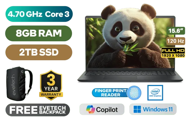 Dell Pro 15 Essential PV15250 Intel Core 3-100U up to 4.70GHz Processor, 10MB Cache, 6x Cores, 8x Threads / 8GB DDR5 RAM / 2TB Ultra-Fast NVME SSD / 15.6" FHD (1920x1080) 120Hz Anti-glare IPS-Level Display / Integrated Intel UHD Graphics / Windows 11 Home (64bit) / Realtek RTL8852BE Wi-Fi 6 Wireless LAN / Bluetooth 5.2 / 720p HD Camera / Finger Print Reader / 2x USB Type-A / 1x USB Type-C / 1x HDMI / 1x SD Card Reader / 1x Microphone and Headphone Combo Jack / 2 Tuned Speakers / Dell Pro 15 PV15250 Essential Intel Core 3 Laptop DealDell Pro 15 Essential PV15250 Intel Core 3-100U up to 4.70GHz Processor, 10MB Cache, 6x Cores, 8x Threads / 8GB DDR5 RAM / 2TB Ultra-Fast NVME SSD / 15.6" FHD (1920x1080) 120Hz Anti-glare IPS-Level Display / Integrated Intel UHD Graphics / Windows 11 Home (64bit) / Realtek RTL8852BE Wi-Fi 6 Wireless LAN / Bluetooth 5.2 / 720p HD Camera / Finger Print Reader / 2x USB Type-A / 1x USB Type-C / 1x HDMI / 1x SD Card Reader / 1x Microphone and Headphone Combo Jack / 2 Tuned Speakers / Dell Pro 15 PV15250 Essential Intel Core 3 Laptop Deal [PV15250_RPLU_004_P_VODA/2TB] / 3 YEARS WARRANTY / [+] GET FREE EVETECH NEO Premium Gaming Backpack+ FREE DELIVERY !