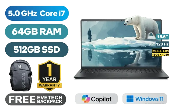 Dell Pro 15 Essential PV15250 5250-4407 13th Intel Core i7-1355U up to 5.0GHz Processor, 12MB Cache, 10x Cores, 12x Threads / 64GB DDR5 RAM / 512GB Ultra-Fast NVME SSD / 15.6" FHD (1920x1080) 120Hz IPS-Level Display / Integrated Intel Iris Xe Graphics / Windows 11 Home (64bit) / Realtek RTL8852BE Wi-Fi 6 Wireless LAN / Bluetooth 5.3 / 720p HD Web Camera / 2x USB Type-A / 1x USB Type-C (Supports DisplayPort / Power Delivery) / 1x HDMI / 1x Microphone and Headphone Combo Jack / 1x SD Card Reader / 2 Tuned Speakers / 1 Year Warranty / Dell Pro 15 Essential PV15250 Intel Core i7 Laptop DealDell Pro 15 Essential PV15250 5250-4407 13th Intel Core i7-1355U up to 5.0GHz Processor, 12MB Cache, 10x Cores, 12x Threads / 64GB DDR5 RAM / 512GB Ultra-Fast NVME SSD / 15.6" FHD (1920x1080) 120Hz IPS-Level Display / Integrated Intel Iris Xe Graphics / Windows 11 Home (64bit) / Realtek RTL8852BE Wi-Fi 6 Wireless LAN / Bluetooth 5.3 / 720p HD Web Camera / 2x USB Type-A / 1x USB Type-C (Supports DisplayPort / Power Delivery) / 1x HDMI / 1x Microphone and Headphone Combo Jack / 1x SD Card Reader / 2 Tuned Speakers / 1 Year Warranty / Dell Pro 15 Essential PV15250 Intel Core i7 Laptop Deal [PV15250_RPLU_007_HOM/64GB] / [+] GET FREE EVETECH FLUX Premium Gaming Backpack+ FREE DELIVERY !