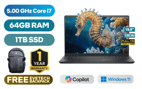 Dell Pro 15 Essential PV15250 13th Generation Intel Core i7-1355U up to 5.00GHz Processor, 12MB Cache, 10x Cores, 12x Threads / 64GB DDR5 RAM / 1TB Ultra-Fast NVME SSD / 15.6" FHD (1920x1080) 120Hz Anti-glare IPS-Level Display / Integrated Intel UHD Graphics / Windows 11 Home (64bit) / Realtek RTL8852BE Wi-Fi 6 Wireless LAN / Bluetooth 5.2 / 720p HD Web Camera / 2x USB Type-A / 1x USB Type-C / 1x HDMI / 1x Microphone and Headphone Combo Jack / 1x SD Card Reader / Non-Backlit Keyboard / 2 Tuned Speakers / 1 Year Warranty / Dell Pro 15 Essential PV15250 Intel Core i7 Laptop DealDell Pro 15 Essential PV15250 13th Generation Intel Core i7-1355U up to 5.00GHz Processor, 12MB Cache, 10x Cores, 12x Threads / 64GB DDR5 RAM / 1TB Ultra-Fast NVME SSD / 15.6" FHD (1920x1080) 120Hz Anti-glare IPS-Level Display / Integrated Intel UHD Graphics / Windows 11 Home (64bit) / Realtek RTL8852BE Wi-Fi 6 Wireless LAN / Bluetooth 5.2 / 720p HD Web Camera / 2x USB Type-A / 1x USB Type-C / 1x HDMI / 1x Microphone and Headphone Combo Jack / 1x SD Card Reader / Non-Backlit Keyboard / 2 Tuned Speakers / 1 Year Warranty / Dell Pro 15 Essential PV15250 Intel Core i7 Laptop Deal [PV15250_RPLU_007_P_HOM/64GB/1TB] / [+] GET FREE EVETECH FLUX Premium Gaming Backpack+ FREE DELIVERY !