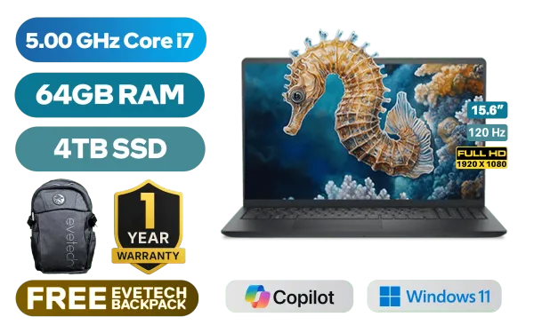 Dell Pro 15 Essential PV15250 13th Generation Intel Core i7-1355U up to 5.00GHz Processor, 12MB Cache, 10x Cores, 12x Threads / 64GB DDR5 RAM / 4TB Ultra-Fast NVME SSD / 15.6" FHD (1920x1080) 120Hz Anti-glare IPS-Level Display / Integrated Intel UHD Graphics / Windows 11 Home (64bit) / Realtek RTL8852BE Wi-Fi 6 Wireless LAN / Bluetooth 5.2 / 720p HD Web Camera / 2x USB Type-A / 1x USB Type-C / 1x HDMI / 1x Microphone and Headphone Combo Jack / 1x SD Card Reader / Non-Backlit Keyboard / 2 Tuned Speakers / 1 Year Warranty / Dell Pro 15 Essential PV15250 Intel Core i7 Laptop DealDell Pro 15 Essential PV15250 13th Generation Intel Core i7-1355U up to 5.00GHz Processor, 12MB Cache, 10x Cores, 12x Threads / 64GB DDR5 RAM / 4TB Ultra-Fast NVME SSD / 15.6" FHD (1920x1080) 120Hz Anti-glare IPS-Level Display / Integrated Intel UHD Graphics / Windows 11 Home (64bit) / Realtek RTL8852BE Wi-Fi 6 Wireless LAN / Bluetooth 5.2 / 720p HD Web Camera / 2x USB Type-A / 1x USB Type-C / 1x HDMI / 1x Microphone and Headphone Combo Jack / 1x SD Card Reader / Non-Backlit Keyboard / 2 Tuned Speakers / 1 Year Warranty / Dell Pro 15 Essential PV15250 Intel Core i7 Laptop Deal [PV15250_RPLU_007_P_HOM/64GB/4TB] / [+] GET FREE EVETECH FLUX Premium Gaming Backpack+ FREE DELIVERY !