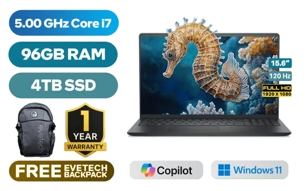 Dell Pro 15 Essential PV15250 13th Generation Intel Core i7-1355U up to 5.00GHz Processor, 12MB Cache, 10x Cores, 12x Threads / 96GB DDR5 RAM / 4TB Ultra-Fast NVME SSD / 15.6" FHD (1920x1080) 120Hz Anti-glare IPS-Level Display / Integrated Intel UHD Graphics / Windows 11 Home (64bit) / Realtek RTL8852BE Wi-Fi 6 Wireless LAN / Bluetooth 5.2 / 720p HD Web Camera / 2x USB Type-A / 1x USB Type-C / 1x HDMI / 1x Microphone and Headphone Combo Jack / 1x SD Card Reader / Non-Backlit Keyboard / 2 Tuned Speakers / 1 Year Warranty / Dell Pro 15 Essential PV15250 Intel Core i7 Laptop DealDell Pro 15 Essential PV15250 13th Generation Intel Core i7-1355U up to 5.00GHz Processor, 12MB Cache, 10x Cores, 12x Threads / 96GB DDR5 RAM / 4TB Ultra-Fast NVME SSD / 15.6" FHD (1920x1080) 120Hz Anti-glare IPS-Level Display / Integrated Intel UHD Graphics / Windows 11 Home (64bit) / Realtek RTL8852BE Wi-Fi 6 Wireless LAN / Bluetooth 5.2 / 720p HD Web Camera / 2x USB Type-A / 1x USB Type-C / 1x HDMI / 1x Microphone and Headphone Combo Jack / 1x SD Card Reader / Non-Backlit Keyboard / 2 Tuned Speakers / 1 Year Warranty / Dell Pro 15 Essential PV15250 Intel Core i7 Laptop Deal [PV15250_RPLU_007_P_HOM/96GB/4TB] / [+] GET FREE EVETECH FLUX Premium Gaming Backpack+ FREE DELIVERY !