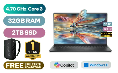 Dell Pro 15 Essential PV15250 Intel Core 3-100U up to 4.70GHz Processor, 10MB Cache, 6x Cores, 8x Threads / 32GB DDR5 RAM / 2TB Ultra-Fast NVME SSD / 15.6" FHD (1920x1080) 120Hz Anti-glare IPS-Level Display / Integrated Intel UHD Graphics / Windows 11 Home (64bit) / Realtek RTL8852BE Wi-Fi 6 Wireless LAN / Bluetooth 5.2 / 720p HD Web Camera / 2x USB Type-A / 1x USB Type-C / 1x HDMI / 1x Microphone and Headphone Combo Jack / 1x SD Card Reader / Non-Backlit Keyboard / 2 Tuned Speakers / 1 Year On-Site Warranty / Dell Pro 15 Essential PV15250 Intel Core 3 Laptop DealDell Pro 15 Essential PV15250 Intel Core 3-100U up to 4.70GHz Processor, 10MB Cache, 6x Cores, 8x Threads / 32GB DDR5 RAM / 2TB Ultra-Fast NVME SSD / 15.6" FHD (1920x1080) 120Hz Anti-glare IPS-Level Display / Integrated Intel UHD Graphics / Windows 11 Home (64bit) / Realtek RTL8852BE Wi-Fi 6 Wireless LAN / Bluetooth 5.2 / 720p HD Web Camera / 2x USB Type-A / 1x USB Type-C / 1x HDMI / 1x Microphone and Headphone Combo Jack / 1x SD Card Reader / Non-Backlit Keyboard / 2 Tuned Speakers / 1 Year On-Site Warranty / Dell Pro 15 Essential PV15250 Intel Core 3 Laptop Deal [PV15250_RPLU_004_P_HOM/32GB/2TB] / [+] GET FREE EVETECH NEO Premium Gaming Backpack+ FREE DELIVERY !