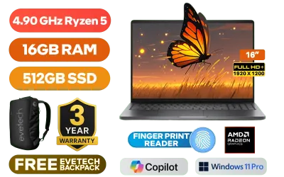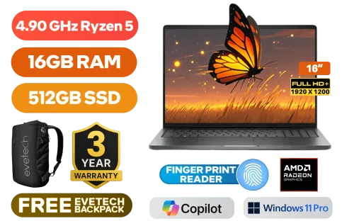 Dell Pro 16 PC16255 AMD Ryzen 5 220 up to 4.90GHz Processor, 22MB Cache, 6x Cores, 12x Threads / 16GB DDR5 RAM / 512GB Ultra-Fast NVMe SSD / 16" FHD+ (1920 x 1200) Anti-Glare, IPS-Level Display / Integrated AMD Radeon Graphics / <span style="color:blue; font-size: 17px;">Windows 11 Professional (64-bit)</span> / MediaTek Wi-Fi 6E MT7922 Wireless LAN / Bluetooth 5.2 / 1080p FHD IR Camera with Privacy Shutter / 2x USB Type-A / 2x USB Type-C (Supports Thunderbolt 4 / Power Delivery 3.1 / DisplayPort) / 1x RJ-45 / 1x HDMI / 1x Headphone & Microphone Combo Jack / Fingerprint Reader / Kensington Lock / White Backlit Keyboard / 4 Stereo speakers with Realtek Audio / Dell Pro 16 PC16255 AMD Ryzen 5 Laptop DealDell Pro 16 PC16255 AMD Ryzen 5 220 up to 4.90GHz Processor, 22MB Cache, 6x Cores, 12x Threads / 16GB DDR5 RAM / 512GB Ultra-Fast NVMe SSD / 16" FHD+ (1920 x 1200) Anti-Glare, IPS-Level Display / Integrated AMD Radeon Graphics / Windows 11 Professional (64-bit) / MediaTek Wi-Fi 6E MT7922 Wireless LAN / Bluetooth 5.2 / 1080p FHD IR Camera with Privacy Shutter / 2x USB Type-A / 2x USB Type-C (Supports Thunderbolt 4 / Power Delivery 3.1 / DisplayPort) / 1x RJ-45 / 1x HDMI / 1x Headphone & Microphone Combo Jack / Fingerprint Reader / Kensington Lock / White Backlit Keyboard / 4 Stereo speakers with Realtek Audio / Dell Pro 16 PC16255 AMD Ryzen 5 Laptop Deal [BTO507_PC16255] / [+] GET FREE EVETECH NEO Premium Gaming Backpack / 3 YEARS WARRANTY + FREE DELIVERY !