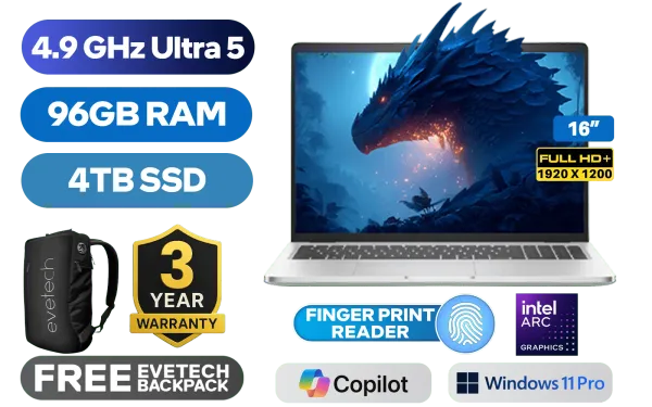Dell Pro 16 Plus Intel® Core™ Ultra 5 235U up to 4.9GHz, 12MB Cache, 12x Cores, 14x Threads / 96GB DDR5 RAM / 4TB Ultra-Fast NVMe SSD / 16" FHD+ (1920 x 1200) Anti-Glare Display / Integrated Intel® Graphics / <span style="color:blue; font-size: 17px;">Windows 11 Pro</span> / Intel Wi-Fi 7 BE201 Wireless LAN / Bluetooth® 5.4 / 1080p FHD Camera / 2x USB Type-A / 2x USB Type-C (Supports Thunderbolt™ 4 / DisplayPort / Power Delivery) / 1x RJ-45 / 1x Microphone & Headset Combo Jack / 1x SIM Card Tray / 1x MicroSD Card Reader / Finger Print Reader / White Backlit Keyboard / 2x Stereo Speakers with Cirrus Logic Audio / Dell Pro 16 Plus Intel Core Ultra 5 Laptop DealDell Pro 16 Plus Intel® Core™ Ultra 5 235U up to 4.9GHz, 12MB Cache, 12x Cores, 14x Threads / 96GB DDR5 RAM / 4TB Ultra-Fast NVMe SSD / 16" FHD+ (1920 x 1200) Anti-Glare Display / Integrated Intel® Graphics / Windows 11 Pro / Intel Wi-Fi 7 BE201 Wireless LAN / Bluetooth® 5.4 / 1080p FHD Camera / 2x USB Type-A / 2x USB Type-C (Supports Thunderbolt™ 4 / DisplayPort / Power Delivery) / 1x RJ-45 / 1x Microphone & Headset Combo Jack / 1x SIM Card Tray / 1x MicroSD Card Reader / Finger Print Reader / White Backlit Keyboard / 2x Stereo Speakers with Cirrus Logic Audio / Dell Pro 16 Plus Intel Core Ultra 5 Laptop Deal [NBDEPB162505161EMEA/96GB/4TB] / 3 YEARS WARRANTY / [+] GET FREE EVETECH NEO Premium Gaming Backpack+ FREE DELIVERY !