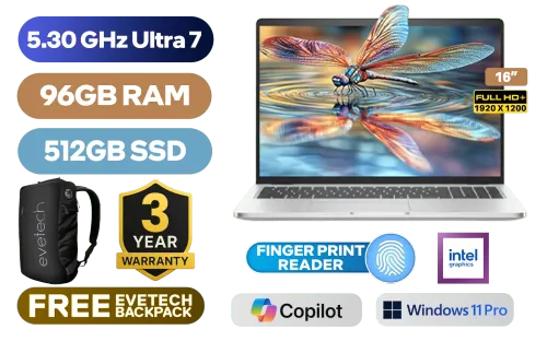 Dell Pro 16 Plus Intel® Core™ Ultra 7-265U up to 5.30GHz, 12MB Cache , 12x Cores, 14x Threads Processor / 96GB DDR5 RAM / 512GB Ultra-Fast NVME SSD / 16" FHD+ (1920x1200) Anti-glare IPS-Level Display / Integrated Intel Graphics / <span style="color:blue; font-size: 17px;">Windows 11 Professional (64bit)</span> / Intel WiFi 6E AX211 Wireless LAN / Bluetooth 5.3 / 1080p FHD IR Camera / 2x USB Type-A / 2x USB Type-C (Supports Thunderbolt 4 / DisplayPort 2.1) / 1x HDMI / 1x SIM Card Slot / 1x Micro SD Card Reader / 1x RJ-45 / 1x Microphone and Headphone Combo Jack / Kensington Lock / White backlight Keyboard / 2x 2W Speakers with Cirrus Logic / Fingerprint Reader / Dell Pro 16 Plus Core Ultra 7 Laptop DealDell Pro 16 Plus Intel® Core™ Ultra 7-265U up to 5.30GHz, 12MB Cache , 12x Cores, 14x Threads Processor / 96GB DDR5 RAM / 512GB Ultra-Fast NVME SSD / 16" FHD+ (1920x1200) Anti-glare IPS-Level Display / Integrated Intel Graphics / Windows 11 Professional (64bit) / Intel WiFi 6E AX211 Wireless LAN / Bluetooth 5.3 / 1080p FHD IR Camera / 2x USB Type-A / 2x USB Type-C (Supports Thunderbolt 4 / DisplayPort 2.1) / 1x HDMI / 1x SIM Card Slot / 1x Micro SD Card Reader / 1x RJ-45 / 1x Microphone and Headphone Combo Jack / Kensington Lock / White backlight Keyboard / 2x 2W Speakers with Cirrus Logic / Fingerprint Reader / Dell Pro 16 Plus Core Ultra 7 Laptop Deal [BTO107_PB16250/96GB] / 3 YEARS WARRANTY / [+] GET FREE EVETECH NEO Premium Gaming Backpack+ FREE DELIVERY !
