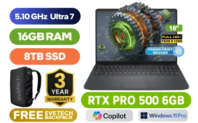 Dell Pro Max 16 Workstation Intel® Core™ Ultra 7-255H up to 5.10GHz Processor, 24MB Cache, 16x Cores, 16x Threads / 16GB DDR5 RAM / 8TB Ultra-Fast NVMe SSD / 16" FHD+ (1920 x 1200) Anti-Glare IPS-Level Display / NVIDIA RTX PRO 500 Blackwell 6GB GDDR7 Dedicated Graphics / <span style="font-size: 20px; color: #00BFFF; font-weight: bold;">Windows 11 Professional (64bit)</span> / Intel® WiFi 7 BE201 Wireless LAN / Bluetooth 5.4 / 1080p FHD IR Web Camera / 2 x USB Type-A / 2 x USB Type-C (Thunderbolt™ 4 / DisplayPort™ / Power Delivery ) / 1 x HDMI / 1 x Headphone & Microphone Combo Jack / 1x RJ-45 / 1x MicroSD / Waves MaxxAudio Pro Stereo Speakers / Fingerprint Reader / White Backlit keyboard / Dell Pro Max 16 Intel Core Ultra 7 RTX PRO 500 Workstation Laptop DealDell Pro Max 16 Workstation Intel® Core™ Ultra 7-255H up to 5.10GHz Processor, 24MB Cache, 16x Cores, 16x Threads / 16GB DDR5 RAM / 8TB Ultra-Fast NVMe SSD / 16" FHD+ (1920 x 1200) Anti-Glare IPS-Level Display / NVIDIA RTX PRO 500 Blackwell 6GB GDDR7 Dedicated Graphics / Windows 11 Professional (64bit) / Intel® WiFi 7 BE201 Wireless LAN / Bluetooth 5.4 / 1080p FHD IR Web Camera / 2 x USB Type-A / 2 x USB Type-C (Thunderbolt™ 4 / DisplayPort™ / Power Delivery ) / 1 x HDMI / 1 x Headphone & Microphone Combo Jack / 1x RJ-45 / 1x MicroSD / Waves MaxxAudio Pro Stereo Speakers / Fingerprint Reader / White Backlit keyboard / Dell Pro Max 16 Intel Core Ultra 7 RTX PRO 500 Workstation Laptop Deal [NBDEMB16250716512EM/8TB] / [+] GET FREE EVETECH NEO Premium Gaming Backpack / 3 YEARS WARRANTY + FREE DELIVERY !