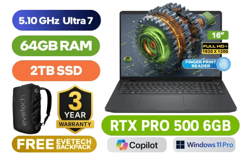 Dell Pro Max 16 Workstation Intel® Core™ Ultra 7-255H up to 5.10GHz Processor, 24MB Cache, 16x Cores, 16x Threads / 64GB DDR5 RAM / 2TB Ultra-Fast NVMe SSD / 16" FHD+ (1920 x 1200) Anti-Glare IPS-Level Display / NVIDIA RTX PRO 500 Blackwell 6GB GDDR7 Dedicated Graphics / <span style="font-size: 20px; color: #00BFFF; font-weight: bold;">Windows 11 Professional (64bit)</span> / Intel® WiFi 7 BE201 Wireless LAN / Bluetooth 5.4 / 1080p FHD IR Web Camera / 2 x USB Type-A / 2 x USB Type-C (Thunderbolt™ 4 / DisplayPort™ / Power Delivery ) / 1 x HDMI / 1 x Headphone & Microphone Combo Jack / 1x RJ-45 / 1x MicroSD / Waves MaxxAudio Pro Stereo Speakers / Fingerprint Reader / White Backlit keyboard / Dell Pro Max 16 Intel Core Ultra 7 RTX PRO 500 Workstation Laptop DealDell Pro Max 16 Workstation Intel® Core™ Ultra 7-255H up to 5.10GHz Processor, 24MB Cache, 16x Cores, 16x Threads / 64GB DDR5 RAM / 2TB Ultra-Fast NVMe SSD / 16" FHD+ (1920 x 1200) Anti-Glare IPS-Level Display / NVIDIA RTX PRO 500 Blackwell 6GB GDDR7 Dedicated Graphics / Windows 11 Professional (64bit) / Intel® WiFi 7 BE201 Wireless LAN / Bluetooth 5.4 / 1080p FHD IR Web Camera / 2 x USB Type-A / 2 x USB Type-C (Thunderbolt™ 4 / DisplayPort™ / Power Delivery ) / 1 x HDMI / 1 x Headphone & Microphone Combo Jack / 1x RJ-45 / 1x MicroSD / Waves MaxxAudio Pro Stereo Speakers / Fingerprint Reader / White Backlit keyboard / Dell Pro Max 16 Intel Core Ultra 7 RTX PRO 500 Workstation Laptop Deal [NBDEMB16250716512EM/64GB/2TB] / [+] GET FREE EVETECH NEO Premium Gaming Backpack / 3 YEARS WARRANTY + FREE DELIVERY !
