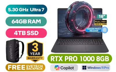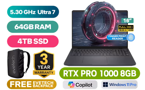 Dell Pro Max 16 Workstation Intel® Core™ Ultra 7-265H up to 5.30GHz Processor, 24MB Cache, 16x Cores, 16x Threads / 64GB DDR5 RAM / 4TB Ultra-Fast NVMe SSD / 16" FHD+ (1920 x 1200) Anti-Glare IPS-Level Display / NVIDIA RTX PRO 1000 Blackwell 8GB GDDR7 / <span style="font-size: 20px; color: #00BFFF; font-weight: bold;">Windows 11 Professional (64bit)</span> / Intel® WiFi 7 BE201 Wireless LAN / Bluetooth 5.4 / 1080p FHD IR Web Camera / 2 x USB Type-A / 2 x USB Type-C (Thunderbolt™ 4 / DisplayPort™ / Power Delivery ) / 1 x HDMI / 1 x Headphone & Microphone Combo Jack / 1x RJ-45 / Waves MaxxAudio Pro Stereo Speakers / Fingerprint Reader / White Backlit keyboard / Dell Pro Max 16 Intel Core Ultra 7 RTX PRO 1000 Workstation Laptop DealDell Pro Max 16 Workstation Intel® Core™ Ultra 7-265H up to 5.30GHz Processor, 24MB Cache, 16x Cores, 16x Threads / 64GB DDR5 RAM / 4TB Ultra-Fast NVMe SSD / 16" FHD+ (1920 x 1200) Anti-Glare IPS-Level Display / NVIDIA RTX PRO 1000 Blackwell 8GB GDDR7 / Windows 11 Professional (64bit) / Intel® WiFi 7 BE201 Wireless LAN / Bluetooth 5.4 / 1080p FHD IR Web Camera / 2 x USB Type-A / 2 x USB Type-C (Thunderbolt™ 4 / DisplayPort™ / Power Delivery ) / 1 x HDMI / 1 x Headphone & Microphone Combo Jack / 1x RJ-45 / Waves MaxxAudio Pro Stereo Speakers / Fingerprint Reader / White Backlit keyboard / Dell Pro Max 16 Intel Core Ultra 7 RTX PRO 1000 Workstation Laptop Deal [NBDEMB1625071618EM/64GB/4TB] / 3 YEARS WARRANTY / [+] GET FREE EVETECH NEO Premium Gaming Backpack+ FREE DELIVERY !