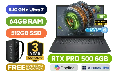 Dell Pro Max 16 Workstation Intel® Core™ Ultra 7-255H up to 5.10GHz Processor, 24MB Cache, 16x Cores, 16x Threads / 64GB DDR5 RAM / 512GB Ultra-Fast NVMe SSD / 16" FHD+ (1920 x 1200) Anti-Glare IPS-Level Display / NVIDIA RTX PRO 500 Blackwell 6GB GDDR7 Dedicated Graphics / <span style="font-size: 20px; color: #00BFFF; font-weight: bold;">Windows 11 Professional (64bit)</span> / Intel® WiFi 7 BE201 Wireless LAN / Bluetooth 5.4 / 1080p FHD IR Web Camera / 2 x USB Type-A / 2 x USB Type-C (Thunderbolt™ 4 / DisplayPort™ / Power Delivery ) / 1 x HDMI / 1 x Headphone & Microphone Combo Jack / 1x RJ-45 / 1x MicroSD / Waves MaxxAudio Pro Stereo Speakers / Fingerprint Reader / White Backlit keyboard / Dell Pro Max 16 Intel Core Ultra 7 RTX PRO 500 Workstation Laptop DealDell Pro Max 16 Workstation Intel® Core™ Ultra 7-255H up to 5.10GHz Processor, 24MB Cache, 16x Cores, 16x Threads / 64GB DDR5 RAM / 512GB Ultra-Fast NVMe SSD / 16" FHD+ (1920 x 1200) Anti-Glare IPS-Level Display / NVIDIA RTX PRO 500 Blackwell 6GB GDDR7 Dedicated Graphics / Windows 11 Professional (64bit) / Intel® WiFi 7 BE201 Wireless LAN / Bluetooth 5.4 / 1080p FHD IR Web Camera / 2 x USB Type-A / 2 x USB Type-C (Thunderbolt™ 4 / DisplayPort™ / Power Delivery ) / 1 x HDMI / 1 x Headphone & Microphone Combo Jack / 1x RJ-45 / 1x MicroSD / Waves MaxxAudio Pro Stereo Speakers / Fingerprint Reader / White Backlit keyboard / Dell Pro Max 16 Intel Core Ultra 7 RTX PRO 500 Workstation Laptop Deal [NBDEMB16250716512EM/64GB] / [+] GET FREE EVETECH NEO Premium Gaming Backpack / 3 YEARS WARRANTY + FREE DELIVERY !