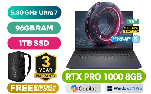 Dell Pro Max 16 Workstation Intel® Core™ Ultra 7-265H up to 5.30GHz Processor, 24MB Cache, 16x Cores, 16x Threads / 96GB DDR5 RAM / 1TB Ultra-Fast NVMe SSD / 16" FHD+ (1920 x 1200) Anti-Glare IPS-Level Display / NVIDIA RTX PRO 1000 Blackwell 8GB GDDR7 / <span style="font-size: 20px; color: #00BFFF; font-weight: bold;">Windows 11 Professional (64bit)</span> / Intel® WiFi 7 BE201 Wireless LAN / Bluetooth 5.4 / 1080p FHD IR Web Camera / 2 x USB Type-A / 2 x USB Type-C (Thunderbolt™ 4 / DisplayPort™ / Power Delivery ) / 1 x HDMI / 1 x Headphone & Microphone Combo Jack / 1x RJ-45 / Waves MaxxAudio Pro Stereo Speakers / Fingerprint Reader / White Backlit keyboard / Dell Pro Max 16 Intel Core Ultra 7 RTX PRO 1000 Workstation Laptop DealDell Pro Max 16 Workstation Intel® Core™ Ultra 7-265H up to 5.30GHz Processor, 24MB Cache, 16x Cores, 16x Threads / 96GB DDR5 RAM / 1TB Ultra-Fast NVMe SSD / 16" FHD+ (1920 x 1200) Anti-Glare IPS-Level Display / NVIDIA RTX PRO 1000 Blackwell 8GB GDDR7 / Windows 11 Professional (64bit) / Intel® WiFi 7 BE201 Wireless LAN / Bluetooth 5.4 / 1080p FHD IR Web Camera / 2 x USB Type-A / 2 x USB Type-C (Thunderbolt™ 4 / DisplayPort™ / Power Delivery ) / 1 x HDMI / 1 x Headphone & Microphone Combo Jack / 1x RJ-45 / Waves MaxxAudio Pro Stereo Speakers / Fingerprint Reader / White Backlit keyboard / Dell Pro Max 16 Intel Core Ultra 7 RTX PRO 1000 Workstation Laptop Deal [NBDEMB1625071618EM/96GB] / 3 YEARS WARRANTY / [+] GET FREE EVETECH NEO Premium Gaming Backpack+ FREE DELIVERY !
