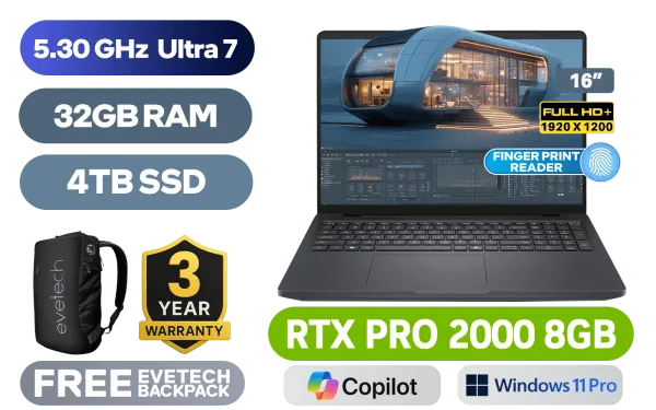 Dell Pro Max 16 6250-6518 Workstation Intel® Core™ Ultra 7-265H up to 5.30GHz Processor, 24MB Cache, 16x Cores, 16x Threads / 32GB DDR5 RAM / 4TB Ultra-Fast NVMe SSD / 16" FHD+ (1920x1200) IPS-Level Display / NVIDIA RTX PRO 2000 Blackwell 8GB GDDR7 / <span style="font-size: 20px; color: #00BFFF; font-weight: bold;">Windows 11 Professional (64bit)</span> / Intel® WiFi 7 BE201 Wireless LAN / Bluetooth 5.4 / 1080p FHD IR Camera / 2 x USB Type-A / 2 x USB Type-C (Thunderbolt 4 / DisplayPort / Power Delivery ) / 1 x HDMI / 1 x Headphone & Microphone Combo Jack / 1x RJ-45 / 1x Micro SD Card Reader / 1x Smart Card Reader / 1x Sim Card Reader / White Backlit keyboard / 2x Stereo Speakers / Fingerprint Reader / Dell Pro Max 16 Core Ultra 7 RTX Pro 2000 Laptop DealDell Pro Max 16 6250-6518 Workstation Intel® Core™ Ultra 7-265H up to 5.30GHz Processor, 24MB Cache, 16x Cores, 16x Threads / 32GB DDR5 RAM / 4TB Ultra-Fast NVMe SSD / 16" FHD+ (1920x1200) IPS-Level Display / NVIDIA RTX PRO 2000 Blackwell 8GB GDDR7 / Windows 11 Professional (64bit) / Intel® WiFi 7 BE201 Wireless LAN / Bluetooth 5.4 / 1080p FHD IR Camera / 2 x USB Type-A / 2 x USB Type-C (Thunderbolt 4 / DisplayPort / Power Delivery ) / 1 x HDMI / 1 x Headphone & Microphone Combo Jack / 1x RJ-45 / 1x Micro SD Card Reader / 1x Smart Card Reader / 1x Sim Card Reader / White Backlit keyboard / 2x Stereo Speakers / Fingerprint Reader / Dell Pro Max 16 Core Ultra 7 RTX Pro 2000 Laptop Deal [BTO128_MC16250/4TB] / 3 YEARS WARRANTY / [+] GET FREE EVETECH NEO Premium Gaming Backpack+ FREE DELIVERY !