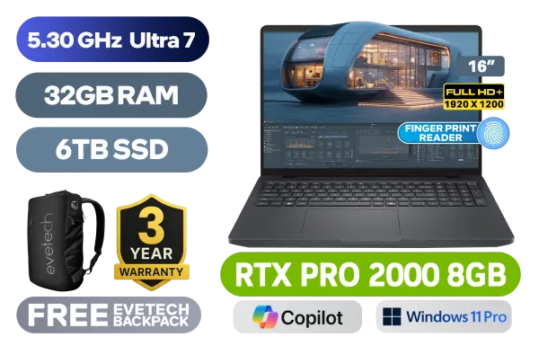 Dell Pro Max 16 6250-6518 Workstation Intel® Core™ Ultra 7-265H up to 5.30GHz Processor, 24MB Cache, 16x Cores, 16x Threads / 32GB DDR5 RAM / 6TB Ultra-Fast NVMe SSD / 16" FHD+ (1920x1200) IPS-Level Display / NVIDIA RTX PRO 2000 Blackwell 8GB GDDR7 / <span style="font-size: 20px; color: #00BFFF; font-weight: bold;">Windows 11 Professional (64bit)</span> / Intel® WiFi 7 BE201 Wireless LAN / Bluetooth 5.4 / 1080p FHD IR Camera / 2 x USB Type-A / 2 x USB Type-C (Thunderbolt 4 / DisplayPort / Power Delivery ) / 1 x HDMI / 1 x Headphone & Microphone Combo Jack / 1x RJ-45 / 1x Micro SD Card Reader / 1x Smart Card Reader (Bay Only) / 1x Sim Card Reader / White Backlit keyboard / 2x Stereo Speakers / Fingerprint Reader / Dell Pro Max 16 Core Ultra 7 RTX Pro 2000 Laptop DealDell Pro Max 16 6250-6518 Workstation Intel® Core™ Ultra 7-265H up to 5.30GHz Processor, 24MB Cache, 16x Cores, 16x Threads / 32GB DDR5 RAM / 6TB Ultra-Fast NVMe SSD / 16" FHD+ (1920x1200) IPS-Level Display / NVIDIA RTX PRO 2000 Blackwell 8GB GDDR7 / Windows 11 Professional (64bit) / Intel® WiFi 7 BE201 Wireless LAN / Bluetooth 5.4 / 1080p FHD IR Camera / 2 x USB Type-A / 2 x USB Type-C (Thunderbolt 4 / DisplayPort / Power Delivery ) / 1 x HDMI / 1 x Headphone & Microphone Combo Jack / 1x RJ-45 / 1x Micro SD Card Reader / 1x Smart Card Reader (Bay Only) / 1x Sim Card Reader / White Backlit keyboard / 2x Stereo Speakers / Fingerprint Reader / Dell Pro Max 16 Core Ultra 7 RTX Pro 2000 Laptop Deal [BTO128_MC16250/6TB] / 3 YEARS WARRANTY / [+] GET FREE EVETECH NEO Premium Gaming Backpack+ FREE DELIVERY !