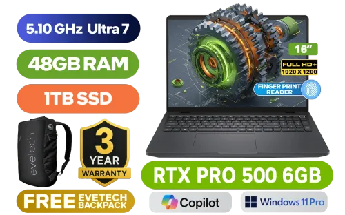 Dell Pro Max 16 Workstation Intel® Core™ Ultra 7-255H up to 5.10GHz Processor, 24MB Cache, 16x Cores, 16x Threads / 48GB DDR5 RAM / 1TB Ultra-Fast NVMe SSD / 16" FHD+ (1920 x 1200) Anti-Glare IPS-Level Display / NVIDIA RTX PRO 500 Blackwell 6GB GDDR7 Dedicated Graphics / <span style="font-size: 20px; color: #00BFFF; font-weight: bold;">Windows 11 Professional (64bit)</span> / Intel® WiFi 7 BE201 Wireless LAN / Bluetooth 5.4 / 1080p FHD IR Web Camera / 2 x USB Type-A / 2 x USB Type-C (Thunderbolt™ 4 / DisplayPort™ / Power Delivery ) / 1 x HDMI / 1 x Headphone & Microphone Combo Jack / 1x RJ-45 / 1x MicroSD / Waves MaxxAudio Pro Stereo Speakers / Fingerprint Reader / White Backlit keyboard / Dell Pro Max 16 Intel Core Ultra 7 RTX PRO 500 Workstation Laptop DealDell Pro Max 16 Workstation Intel® Core™ Ultra 7-255H up to 5.10GHz Processor, 24MB Cache, 16x Cores, 16x Threads / 48GB DDR5 RAM / 1TB Ultra-Fast NVMe SSD / 16" FHD+ (1920 x 1200) Anti-Glare IPS-Level Display / NVIDIA RTX PRO 500 Blackwell 6GB GDDR7 Dedicated Graphics / Windows 11 Professional (64bit) / Intel® WiFi 7 BE201 Wireless LAN / Bluetooth 5.4 / 1080p FHD IR Web Camera / 2 x USB Type-A / 2 x USB Type-C (Thunderbolt™ 4 / DisplayPort™ / Power Delivery ) / 1 x HDMI / 1 x Headphone & Microphone Combo Jack / 1x RJ-45 / 1x MicroSD / Waves MaxxAudio Pro Stereo Speakers / Fingerprint Reader / White Backlit keyboard / Dell Pro Max 16 Intel Core Ultra 7 RTX PRO 500 Workstation Laptop Deal [NBDEMB16250716512EM/48GB/1TB] / [+] GET FREE EVETECH NEO Premium Gaming Backpack / 3 YEARS WARRANTY + FREE DELIVERY !
