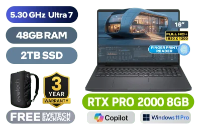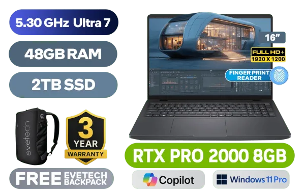 Dell Pro Max 16 6250-6518 Workstation Intel® Core™ Ultra 7-265H up to 5.30GHz Processor, 24MB Cache, 16x Cores, 16x Threads / 48GB DDR5 RAM / 2TB Ultra-Fast NVMe SSD / 16" FHD+ (1920x1200) IPS-Level Display / NVIDIA RTX PRO 2000 Blackwell 8GB GDDR7 / <span style="font-size: 20px; color: #00BFFF; font-weight: bold;">Windows 11 Professional (64bit)</span> / Intel® WiFi 7 BE201 Wireless LAN / Bluetooth 5.4 / 1080p FHD IR Camera / 2 x USB Type-A / 2 x USB Type-C (Thunderbolt 4 / DisplayPort / Power Delivery ) / 1 x HDMI / 1 x Headphone & Microphone Combo Jack / 1x RJ-45 / 1x Micro SD Card Reader / 1x Smart Card Reader / 1x Sim Card Reader / White Backlit keyboard / 2x Stereo Speakers / Fingerprint Reader / Dell Pro Max 16 Core Ultra 7 RTX Pro 2000 Laptop DealDell Pro Max 16 6250-6518 Workstation Intel® Core™ Ultra 7-265H up to 5.30GHz Processor, 24MB Cache, 16x Cores, 16x Threads / 48GB DDR5 RAM / 2TB Ultra-Fast NVMe SSD / 16" FHD+ (1920x1200) IPS-Level Display / NVIDIA RTX PRO 2000 Blackwell 8GB GDDR7 / Windows 11 Professional (64bit) / Intel® WiFi 7 BE201 Wireless LAN / Bluetooth 5.4 / 1080p FHD IR Camera / 2 x USB Type-A / 2 x USB Type-C (Thunderbolt 4 / DisplayPort / Power Delivery ) / 1 x HDMI / 1 x Headphone & Microphone Combo Jack / 1x RJ-45 / 1x Micro SD Card Reader / 1x Smart Card Reader / 1x Sim Card Reader / White Backlit keyboard / 2x Stereo Speakers / Fingerprint Reader / Dell Pro Max 16 Core Ultra 7 RTX Pro 2000 Laptop Deal [BTO128_MC16250/48GB/2TB] / 3 YEARS WARRANTY / [+] GET FREE EVETECH NEO Premium Gaming Backpack+ FREE DELIVERY !