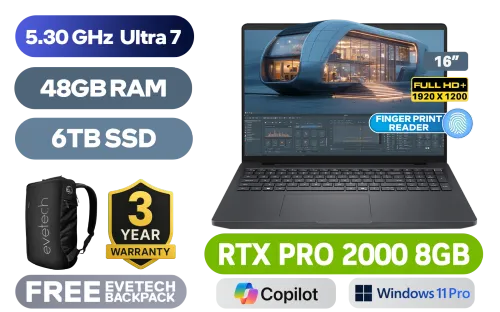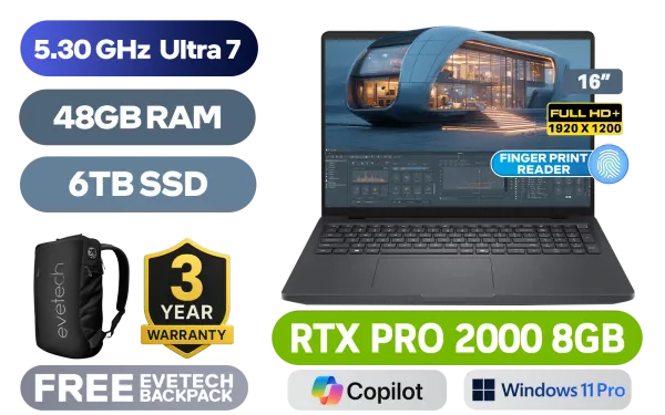 Dell Pro Max 16 6250-6518 Workstation Intel® Core™ Ultra 7-265H up to 5.30GHz Processor, 24MB Cache, 16x Cores, 16x Threads / 48GB DDR5 RAM / 6TB Ultra-Fast NVMe SSD / 16" FHD+ (1920x1200) IPS-Level Display / NVIDIA RTX PRO 2000 Blackwell 8GB GDDR7 / <span style="font-size: 20px; color: #00BFFF; font-weight: bold;">Windows 11 Professional (64bit)</span> / Intel® WiFi 7 BE201 Wireless LAN / Bluetooth 5.4 / 1080p FHD IR Camera / 2 x USB Type-A / 2 x USB Type-C (Thunderbolt 4 / DisplayPort / Power Delivery ) / 1 x HDMI / 1 x Headphone & Microphone Combo Jack / 1x RJ-45 / 1x Micro SD Card Reader / 1x Smart Card Reader (Bay Only) / 1x Sim Card Reader / White Backlit keyboard / 2x Stereo Speakers / Fingerprint Reader / Dell Pro Max 16 Core Ultra 7 RTX Pro 2000 Laptop DealDell Pro Max 16 6250-6518 Workstation Intel® Core™ Ultra 7-265H up to 5.30GHz Processor, 24MB Cache, 16x Cores, 16x Threads / 48GB DDR5 RAM / 6TB Ultra-Fast NVMe SSD / 16" FHD+ (1920x1200) IPS-Level Display / NVIDIA RTX PRO 2000 Blackwell 8GB GDDR7 / Windows 11 Professional (64bit) / Intel® WiFi 7 BE201 Wireless LAN / Bluetooth 5.4 / 1080p FHD IR Camera / 2 x USB Type-A / 2 x USB Type-C (Thunderbolt 4 / DisplayPort / Power Delivery ) / 1 x HDMI / 1 x Headphone & Microphone Combo Jack / 1x RJ-45 / 1x Micro SD Card Reader / 1x Smart Card Reader (Bay Only) / 1x Sim Card Reader / White Backlit keyboard / 2x Stereo Speakers / Fingerprint Reader / Dell Pro Max 16 Core Ultra 7 RTX Pro 2000 Laptop Deal [BTO128_MC16250/48GB/6TB] / 3 YEARS WARRANTY / [+] GET FREE EVETECH NEO Premium Gaming Backpack+ FREE DELIVERY !