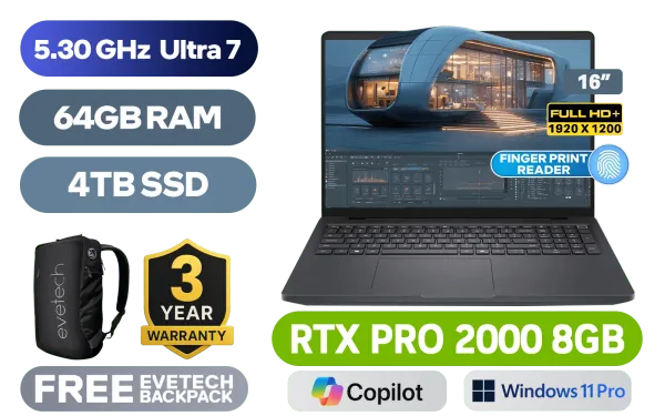 Dell Pro Max 16 6250-6518 Workstation Intel® Core⢠Ultra 7-265H up to 5.30GHz Processor, 24MB Cache, 16x Cores, 16x Threads / 64GB DDR5 RAM / 4TB Ultra-Fast NVMe SSD / 16" FHD+ (1920x1200) IPS-Level Display / NVIDIA RTX PRO 2000 Blackwell 8GB GDDR7 / <span style="font-size: 20px; color: #00BFFF; font-weight: bold;">Windows 11 Professional (64bit)</span> / Intel® WiFi 7 BE201 Wireless LAN / Bluetooth 5.4 / 1080p FHD IR Camera / 2 x USB Type-A / 2 x USB Type-C (Thunderbolt 4 / DisplayPort / Power Delivery ) / 1 x HDMI / 1 x Headphone & Microphone Combo Jack / 1x RJ-45 / 1x Micro SD Card Reader / 1x Smart Card Reader / 1x Sim Card Reader / White Backlit keyboard / 2x Stereo Speakers / Fingerprint Reader / Dell Pro Max 16 Core Ultra 7 RTX Pro 2000 Laptop DealDell Pro Max 16 6250-6518 Workstation Intel® Core⢠Ultra 7-265H up to 5.30GHz Processor, 24MB Cache, 16x Cores, 16x Threads / 64GB DDR5 RAM / 4TB Ultra-Fast NVMe SSD / 16" FHD+ (1920x1200) IPS-Level Display / NVIDIA RTX PRO 2000 Blackwell 8GB GDDR7 / Windows 11 Professional (64bit) / Intel® WiFi 7 BE201 Wireless LAN / Bluetooth 5.4 / 1080p FHD IR Camera / 2 x USB Type-A / 2 x USB Type-C (Thunderbolt 4 / DisplayPort / Power Delivery ) / 1 x HDMI / 1 x Headphone & Microphone Combo Jack / 1x RJ-45 / 1x Micro SD Card Reader / 1x Smart Card Reader / 1x Sim Card Reader / White Backlit keyboard / 2x Stereo Speakers / Fingerprint Reader / Dell Pro Max 16 Core Ultra 7 RTX Pro 2000 Laptop Deal [BTO128_MC16250/64GB/4TB] / 3 YEARS WARRANTY / [+] GET FREE EVETECH NEO Premium Gaming Backpack+ FREE DELIVERY !