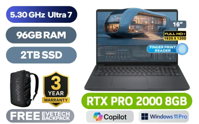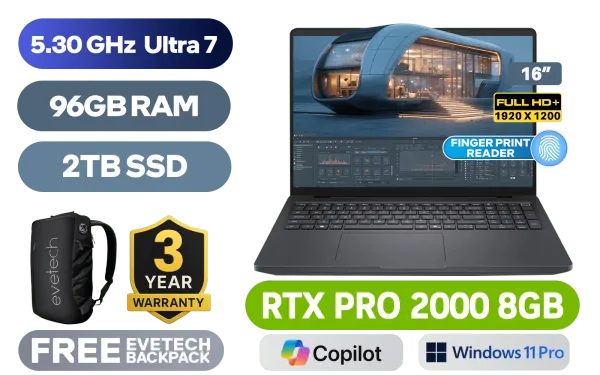 Dell Pro Max 16 6250-6518 Workstation Intel® Core™ Ultra 7-265H up to 5.30GHz Processor, 24MB Cache, 16x Cores, 16x Threads / 96GB DDR5 RAM / 2TB Ultra-Fast NVMe SSD / 16" FHD+ (1920x1200) IPS-Level Display / NVIDIA RTX PRO 2000 Blackwell 8GB GDDR7 / <span style="font-size: 20px; color: #00BFFF; font-weight: bold;">Windows 11 Professional (64bit)</span> / Intel® WiFi 7 BE201 Wireless LAN / Bluetooth 5.4 / 1080p FHD IR Camera / 2 x USB Type-A / 2 x USB Type-C (Thunderbolt 4 / DisplayPort / Power Delivery ) / 1 x HDMI / 1 x Headphone & Microphone Combo Jack / 1x RJ-45 / 1x Micro SD Card Reader / 1x Smart Card Reader / 1x Sim Card Reader / White Backlit keyboard / 2x Stereo Speakers / Fingerprint Reader / Dell Pro Max 16 Core Ultra 7 RTX Pro 2000 Laptop DealDell Pro Max 16 6250-6518 Workstation Intel® Core™ Ultra 7-265H up to 5.30GHz Processor, 24MB Cache, 16x Cores, 16x Threads / 96GB DDR5 RAM / 2TB Ultra-Fast NVMe SSD / 16" FHD+ (1920x1200) IPS-Level Display / NVIDIA RTX PRO 2000 Blackwell 8GB GDDR7 / Windows 11 Professional (64bit) / Intel® WiFi 7 BE201 Wireless LAN / Bluetooth 5.4 / 1080p FHD IR Camera / 2 x USB Type-A / 2 x USB Type-C (Thunderbolt 4 / DisplayPort / Power Delivery ) / 1 x HDMI / 1 x Headphone & Microphone Combo Jack / 1x RJ-45 / 1x Micro SD Card Reader / 1x Smart Card Reader / 1x Sim Card Reader / White Backlit keyboard / 2x Stereo Speakers / Fingerprint Reader / Dell Pro Max 16 Core Ultra 7 RTX Pro 2000 Laptop Deal [BTO128_MC16250/96GB/2TB] / 3 YEARS WARRANTY / [+] GET FREE EVETECH NEO Premium Gaming Backpack+ FREE DELIVERY !