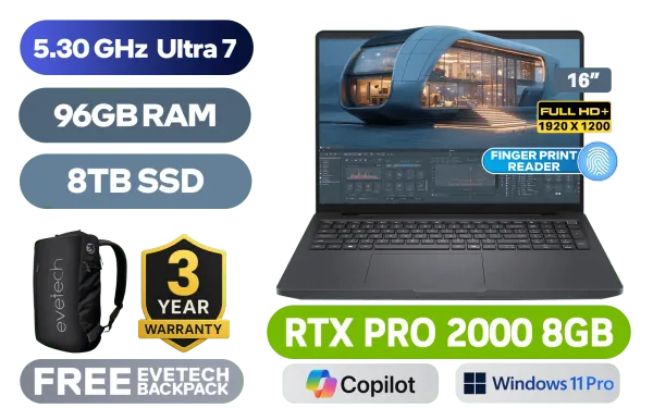 Dell Pro Max 16 6250-6518 Workstation Intel® Core™ Ultra 7-265H up to 5.30GHz Processor, 24MB Cache, 16x Cores, 16x Threads / 96GB DDR5 RAM / 8TB Ultra-Fast NVMe SSD / 16" FHD+ (1920x1200) IPS-Level Display / NVIDIA RTX PRO 2000 Blackwell 8GB GDDR7 / <span style="font-size: 20px; color: #00BFFF; font-weight: bold;">Windows 11 Professional (64bit)</span> / Intel® WiFi 7 BE201 Wireless LAN / Bluetooth 5.4 / 1080p FHD IR Camera / 2 x USB Type-A / 2 x USB Type-C (Thunderbolt 4 / DisplayPort / Power Delivery ) / 1 x HDMI / 1 x Headphone & Microphone Combo Jack / 1x RJ-45 / 1x Micro SD Card Reader / 1x Smart Card Reader / 1x Sim Card Reader / White Backlit keyboard / 2x Stereo Speakers / Fingerprint Reader / Dell Pro Max 16 Core Ultra 7 RTX Pro 2000 Laptop DealDell Pro Max 16 6250-6518 Workstation Intel® Core™ Ultra 7-265H up to 5.30GHz Processor, 24MB Cache, 16x Cores, 16x Threads / 96GB DDR5 RAM / 8TB Ultra-Fast NVMe SSD / 16" FHD+ (1920x1200) IPS-Level Display / NVIDIA RTX PRO 2000 Blackwell 8GB GDDR7 / Windows 11 Professional (64bit) / Intel® WiFi 7 BE201 Wireless LAN / Bluetooth 5.4 / 1080p FHD IR Camera / 2 x USB Type-A / 2 x USB Type-C (Thunderbolt 4 / DisplayPort / Power Delivery ) / 1 x HDMI / 1 x Headphone & Microphone Combo Jack / 1x RJ-45 / 1x Micro SD Card Reader / 1x Smart Card Reader / 1x Sim Card Reader / White Backlit keyboard / 2x Stereo Speakers / Fingerprint Reader / Dell Pro Max 16 Core Ultra 7 RTX Pro 2000 Laptop Deal [BTO128_MC16250/96GB/8TB] / 3 YEARS WARRANTY / [+] GET FREE EVETECH NEO Premium Gaming Backpack+ FREE DELIVERY !