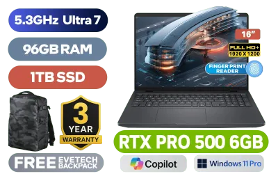 Dell Pro Max 16 6250-6877 Intel® Core™ Ultra 7-265H up to 5.3GHz Processor, 24MB Cache, 16x Cores, 16x Threads / 96GB DDR5 RAM / 1TB Ultra-Fast NVMe SSD / 16" FHD+ (1920x1200) LCD Display / NVIDIA RTX Pro 500 Blackwell 6GB GDDR7 / <span style="font-size: 20px; color: #00BFFF; font-weight: bold;">Windows 11 Professional (64bit)</span> / Intel WiFi 6 BE201 Wireless LAN / Bluetooth 5.4 / 1080p FHD IR Web Camera / 2x USB Type-A / 2x USB Type-C (Supports Thunderbolt 4 / DisplayPort / Power Delivery ) / 1 x HDMI / 1 x Headphone & Microphone Combo Jack / 1x RJ-45 / White Backlit keyboard / 2x Stereo Speakers / Fingerprint Reader / Dell Pro Max 16 MC16250 Core Ultra 7 RTX Pro 500 Laptop DealDell Pro Max 16 6250-6877 Intel® Core™ Ultra 7-265H up to 5.3GHz Processor, 24MB Cache, 16x Cores, 16x Threads / 96GB DDR5 RAM / 1TB Ultra-Fast NVMe SSD / 16" FHD+ (1920x1200) LCD Display / NVIDIA RTX Pro 500 Blackwell 6GB GDDR7 / Windows 11 Professional (64bit) / Intel WiFi 6 BE201 Wireless LAN / Bluetooth 5.4 / 1080p FHD IR Web Camera / 2x USB Type-A / 2x USB Type-C (Supports Thunderbolt 4 / DisplayPort / Power Delivery ) / 1 x HDMI / 1 x Headphone & Microphone Combo Jack / 1x RJ-45 / White Backlit keyboard / 2x Stereo Speakers / Fingerprint Reader / Dell Pro Max 16 MC16250 Core Ultra 7 RTX Pro 500 Laptop Deal [BTO122_MC16250/96GB] / [+] GET FREE EVETECH DASH Premium Gaming Backpack / 3 YEARS WARRANTY + FREE DELIVERY !