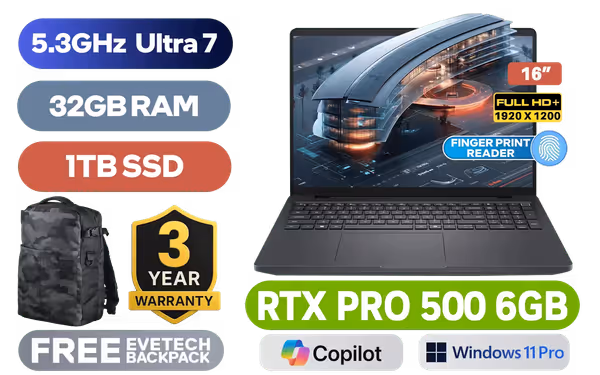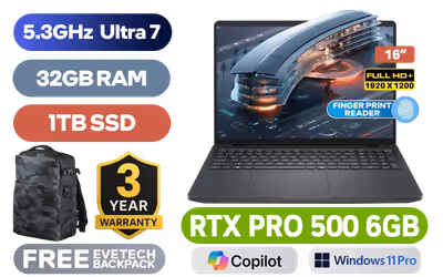 Dell Pro Max 16 6250-6877 Intel® Core™ Ultra 7-265H up to 5.3GHz Processor, 24MB Cache, 16x Cores, 16x Threads / 32GB DDR5 RAM / 1TB Ultra-Fast NVMe SSD / 16" FHD+ (1920x1200) LCD Display / NVIDIA RTX Pro 500 Blackwell 6GB GDDR7 / <span style="font-size: 20px; color: #00BFFF; font-weight: bold;">Windows 11 Professional (64bit)</span> / Intel WiFi 6 BE201 Wireless LAN / Bluetooth 5.4 / 1080p FHD IR Web Camera / 2x USB Type-A / 2x USB Type-C (Supports Thunderbolt 4 / DisplayPort / Power Delivery ) / 1 x HDMI / 1 x Headphone & Microphone Combo Jack / 1x RJ-45 / White Backlit keyboard / 2x Stereo Speakers / Fingerprint Reader / Dell Pro Max 16 MC16250 Core Ultra 7 RTX Pro 500 Laptop DealDell Pro Max 16 6250-6877 Intel® Core™ Ultra 7-265H up to 5.3GHz Processor, 24MB Cache, 16x Cores, 16x Threads / 32GB DDR5 RAM / 1TB Ultra-Fast NVMe SSD / 16" FHD+ (1920x1200) LCD Display / NVIDIA RTX Pro 500 Blackwell 6GB GDDR7 / Windows 11 Professional (64bit) / Intel WiFi 6 BE201 Wireless LAN / Bluetooth 5.4 / 1080p FHD IR Web Camera / 2x USB Type-A / 2x USB Type-C (Supports Thunderbolt 4 / DisplayPort / Power Delivery ) / 1 x HDMI / 1 x Headphone & Microphone Combo Jack / 1x RJ-45 / White Backlit keyboard / 2x Stereo Speakers / Fingerprint Reader / Dell Pro Max 16 MC16250 Core Ultra 7 RTX Pro 500 Laptop Deal [BTO122_MC16250] / [+] GET FREE EVETECH DASH Premium Gaming Backpack / 3 YEARS WARRANTY + FREE DELIVERY !