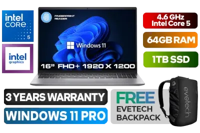Dell Vostro 16 5640 Intel® Core⢠5-120U up to 5.00GHz Processor, 12MB Cache, 10x Cores, 12x Threads / 64GB DDR5 RAM / 1TB Ultra-Fast NVME SSD / 16" FHD+ 1920x1200 Anti-glare Wide-view LED Display / Integrated Intel Graphics / Windows 11 Professional (64bit) / Realtek RTL 8852BE Wi-Fi 6 Wireless LAN / Bluetooth 5.3 / 1080P Full HD 30FPS Webcam with Array Microphones / Finger Print Reader / 2x USB 3.2 Type-A / 1x USB 3.2 Type-C (With Displayport) / 1x HDMI 1.4 / 1x RJ45 Ethernet port / 1x Audio and Headphone Combo Jack / 1x SD Card Reader / Full Size White Backlit Keyboard / Dell Vostro 16 5640 Intel® Core⢠5 Laptop DealDell Vostro 16 5640 Intel® Core⢠5-120U up to 5.00GHz Processor, 12MB Cache, 10x Cores, 12x Threads / 64GB DDR5 RAM / 1TB Ultra-Fast NVME SSD / 16" FHD+ 1920x1200 Anti-glare Wide-view LED Display / Integrated Intel Graphics / Windows 11 Professional (64bit) / Realtek RTL 8852BE Wi-Fi 6 Wireless LAN / Bluetooth 5.3 / 1080P Full HD 30FPS Webcam with Array Microphones / Finger Print Reader / 2x USB 3.2 Type-A / 1x USB 3.2 Type-C (With Displayport) / 1x HDMI 1.4 / 1x RJ45 Ethernet port / 1x Audio and Headphone Combo Jack / 1x SD Card Reader / Full Size White Backlit Keyboard / Dell Vostro 16 5640 Intel® Core⢠5 Laptop Deal [N1002VNB5640EMEA01/64GB/1TB] / 3 YEARS WARRANTY / [+] GET FREE EVETECH NEO Premium Gaming Backpack+ FREE DELIVERY !