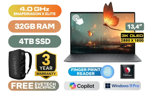 [TOUCHSCREEN] Dell XPS 13 9345-1136 Snapdragon X Elite X1E-80-100 up to 4.0GHz Processor, 42MB Cache, 12x Cores / 32GB LPDDR5X RAM / 4TB Ultra-Fast NVMe SSD / 13.4" 3K (2880x1800) OLED Touchscreen Display / Qualcomm Adreno Graphics / <span style="font-size: 20px; color: #00BFFF; font-weight: bold;">Windows 11 Professional (64bit)</span> / FHD 1080p Web Camera with Dual Array Microphone / Qualcomm FastConnect 7800 Wi-Fi 7 Wireless LAN / Bluetooth 5.4 / Graphite White Backlit Keyboard / Fingerprint Reader / 2 x USB Type-C USB4 (Power Delivery/DisplayPort) / 2W x 4 Dual Qualcomm speakers / Dell XPS 13 9345 Snapdragon X Elite Laptop Deal[TOUCHSCREEN] Dell XPS 13 9345-1136 Snapdragon X Elite X1E-80-100 up to 4.0GHz Processor, 42MB Cache, 12x Cores / 32GB LPDDR5X RAM / 4TB Ultra-Fast NVMe SSD / 13.4" 3K (2880x1800) OLED Touchscreen Display / Qualcomm Adreno Graphics / Windows 11 Professional (64bit) / FHD 1080p Web Camera with Dual Array Microphone / Qualcomm FastConnect 7800 Wi-Fi 7 Wireless LAN / Bluetooth 5.4 / Graphite White Backlit Keyboard / Fingerprint Reader / 2 x USB Type-C USB4 (Power Delivery/DisplayPort) / 2W x 4 Dual Qualcomm speakers / Dell XPS 13 9345 Snapdragon X Elite Laptop Deal [NBDEX9345XE321W11PE/4TB] / 3 YEARS WARRANTY / [+] GET FREE EVETECH NEO Premium Gaming Backpack+ FREE DELIVERY !