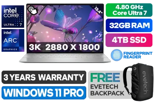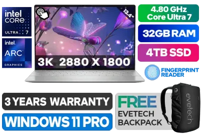[TOUCHSCREEN] Dell XPS 13 9350-5909 Intel Core Ultra 7-258V up to 4.80GHz Processor, 12MB Cache, 8x Cores, 8x Threads / 32GB LPDDR5 RAM / 4TB Ultra-Fast NVMe SSD / 13.4" 3K (2880x1800) OLED Anti-Reflect With Touch Screen Display / Intel Arc Graphics, Supports DirectX 12 / <span style="font-size: 20px; color: #00BFFF; font-weight: bold;">Windows 11 Professional (64bit)</span> / FHD Web Camera with Dual Array Microphone / Intel Wi-Fi 7 BE201 Wireless LAN / Bluetooth 5.4 / Fingerprint Reader / 2 x USB Type-C Thunderbolt 4 (Power Delivery/DisplayPort) / 2W x 4 Dual Realtek speakers / Dell XPS 13 9350 Intel Core Ultra 7 TouchScreen Ultrabook Deal[TOUCHSCREEN] Dell XPS 13 9350-5909 Intel Core Ultra 7-258V up to 4.80GHz Processor, 12MB Cache, 8x Cores, 8x Threads / 32GB LPDDR5 RAM / 4TB Ultra-Fast NVMe SSD / 13.4" 3K (2880x1800) OLED Anti-Reflect With Touch Screen Display / Intel Arc Graphics, Supports DirectX 12 / Windows 11 Professional (64bit) / FHD Web Camera with Dual Array Microphone / Intel Wi-Fi 7 BE201 Wireless LAN / Bluetooth 5.4 / Fingerprint Reader / 2 x USB Type-C Thunderbolt 4 (Power Delivery/DisplayPort) / 2W x 4 Dual Realtek speakers / Dell XPS 13 9350 Intel Core Ultra 7 TouchScreen Ultrabook Deal [NBDEX9350OTU73211PE/4TB] / 3 YEARS WARRANTY / [+] GET FREE EVETECH NEO Premium Gaming Backpack+ FREE DELIVERY !